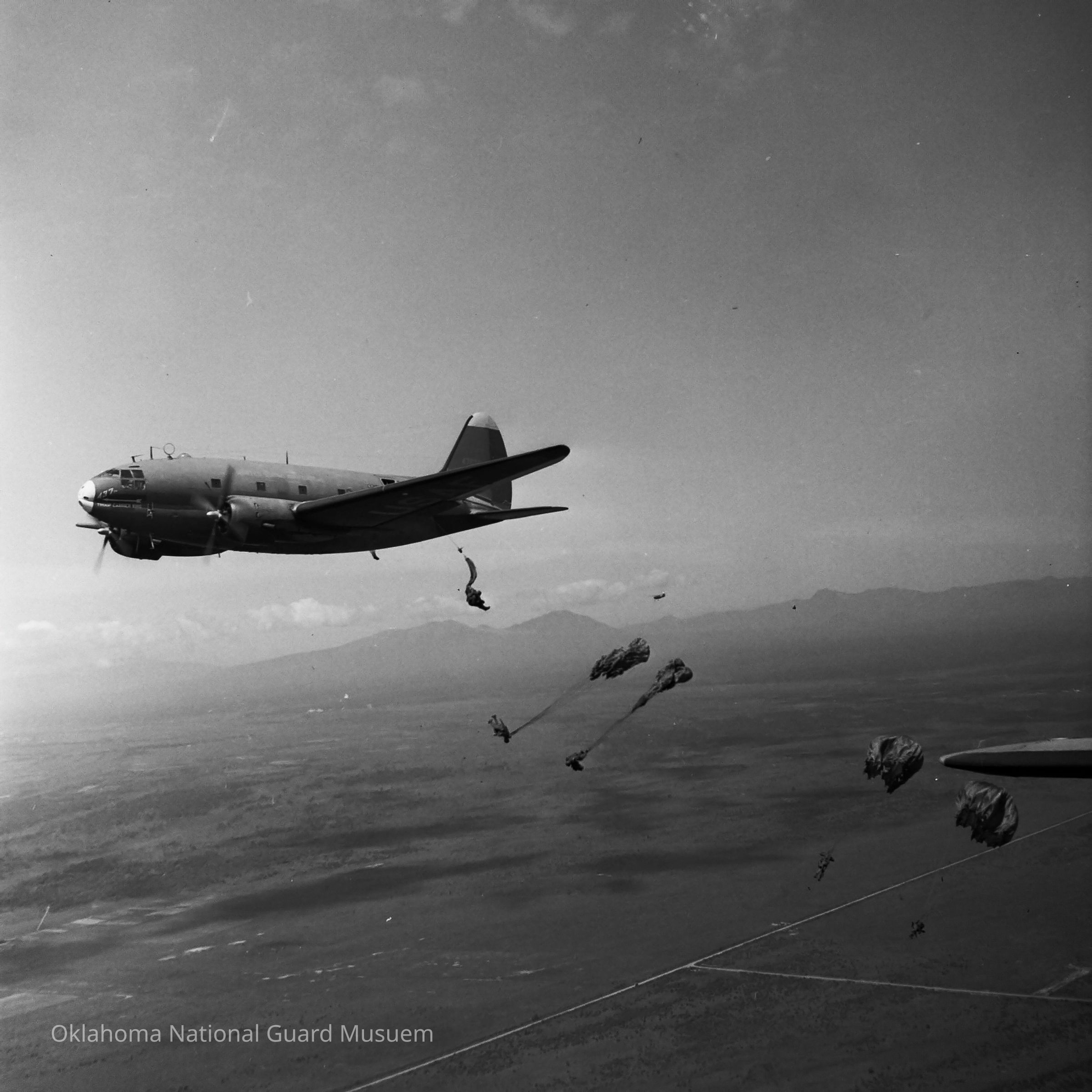 Negative of paratroopers jumping from a C-46. 45th Special Forces