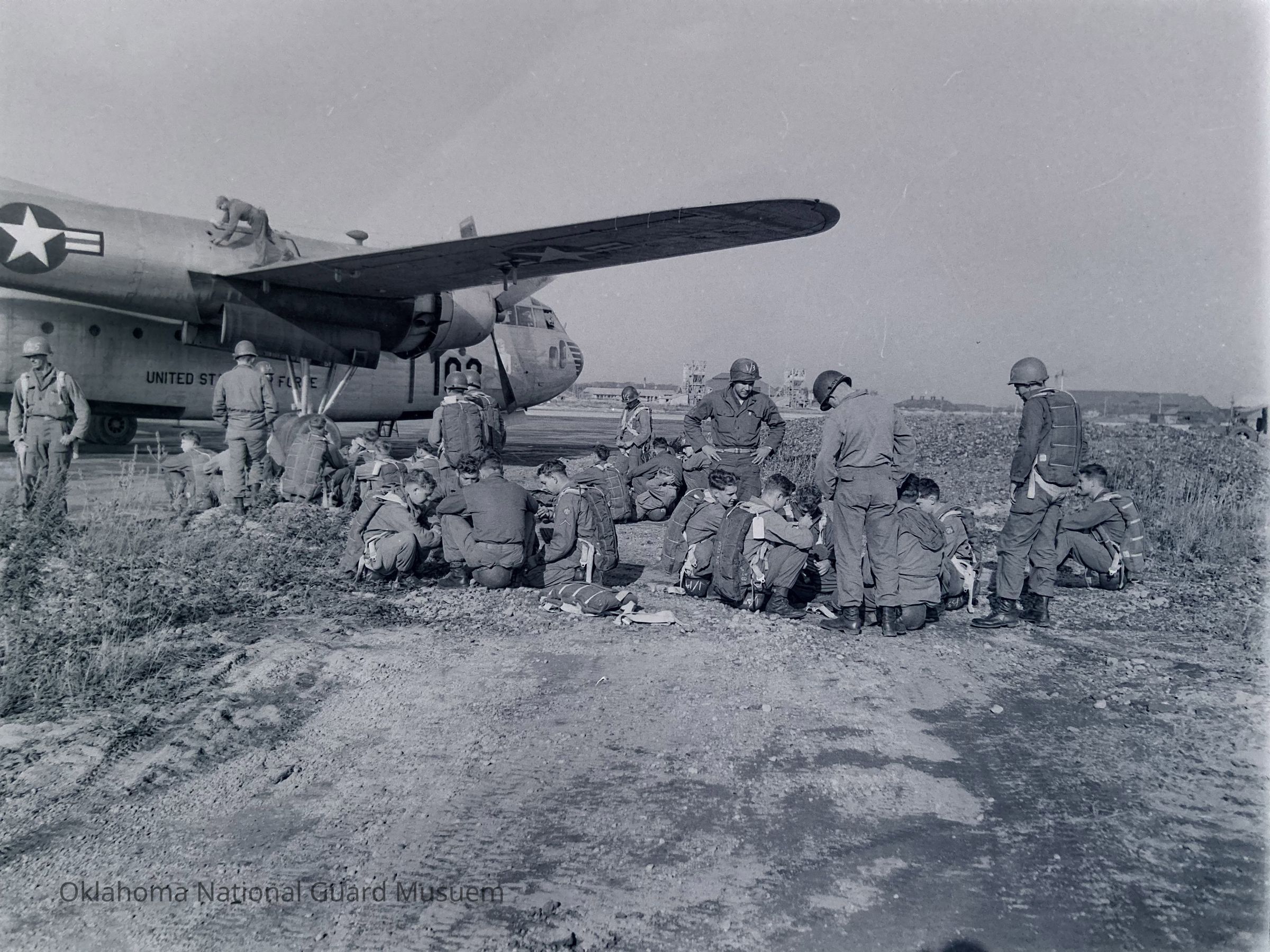 Negative of paratroopers preparing to board a C-119 aircraft on Hokkaido, Japan. 45th Special Forces