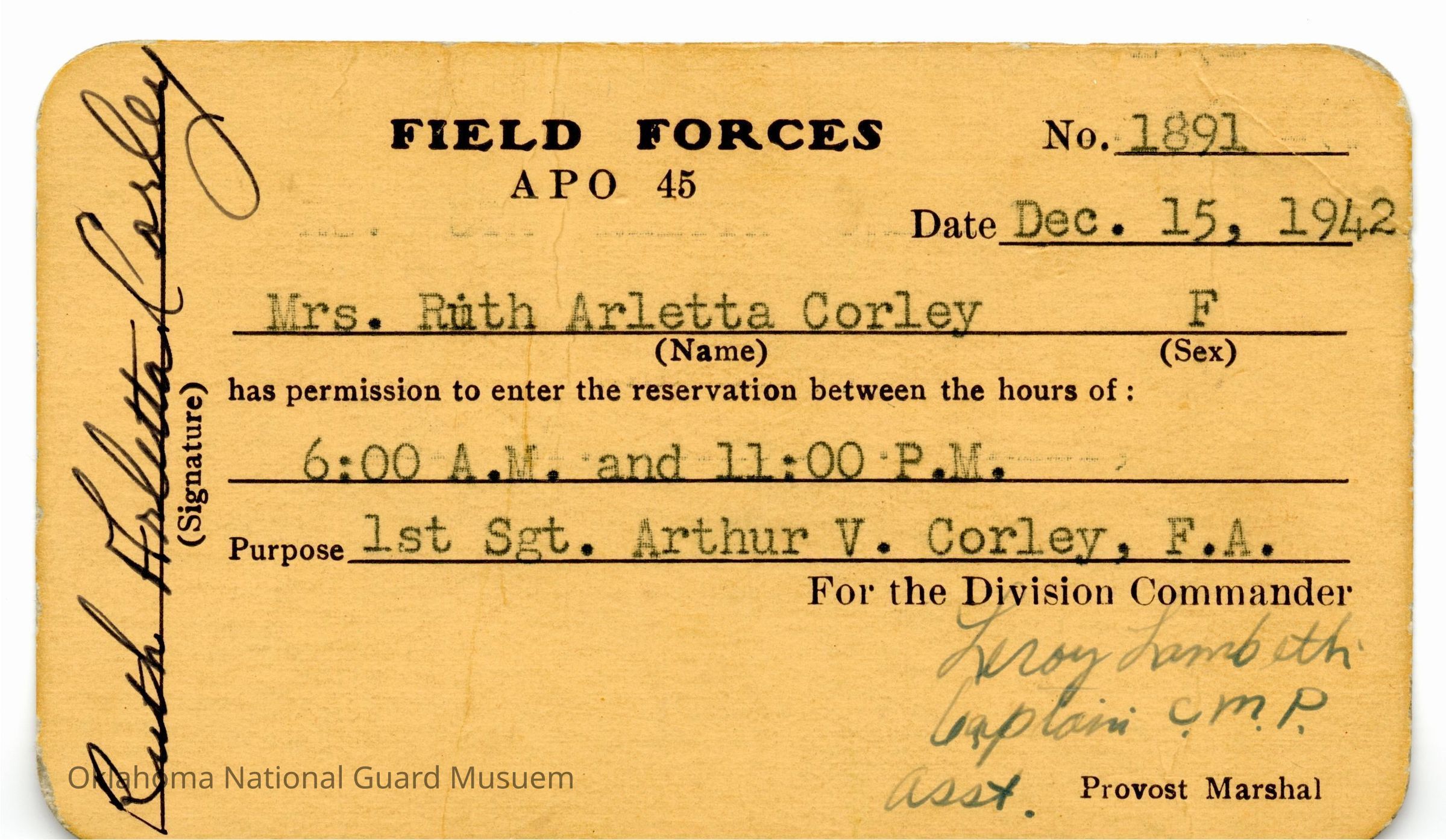 Pass allowing Ruth Arletta Corley to visit Pine Camp. Ruth is the wife of Arthur V. Corley 189th Field Artillery