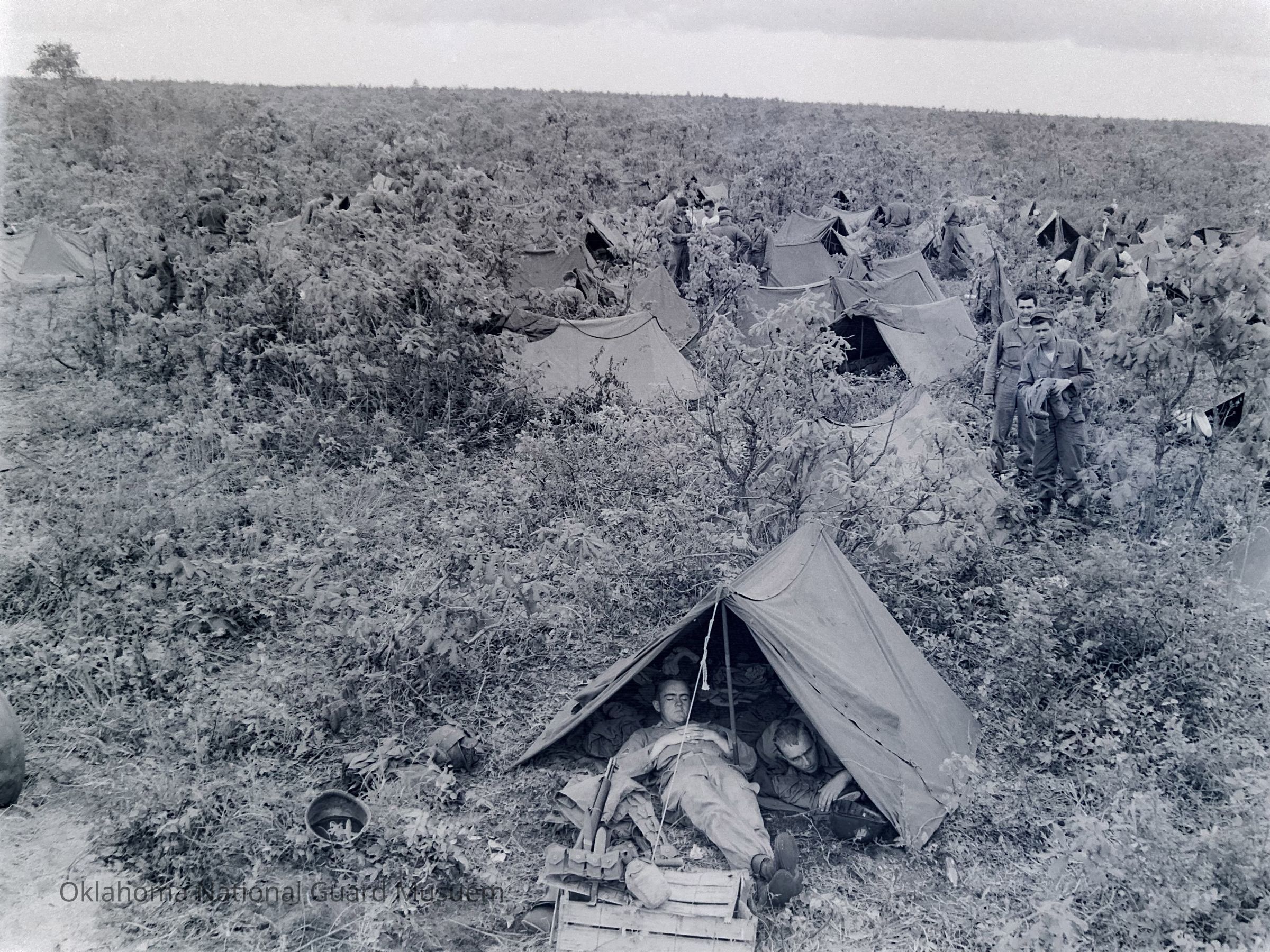 Platoon of soldiers in pup tents in a scrub area