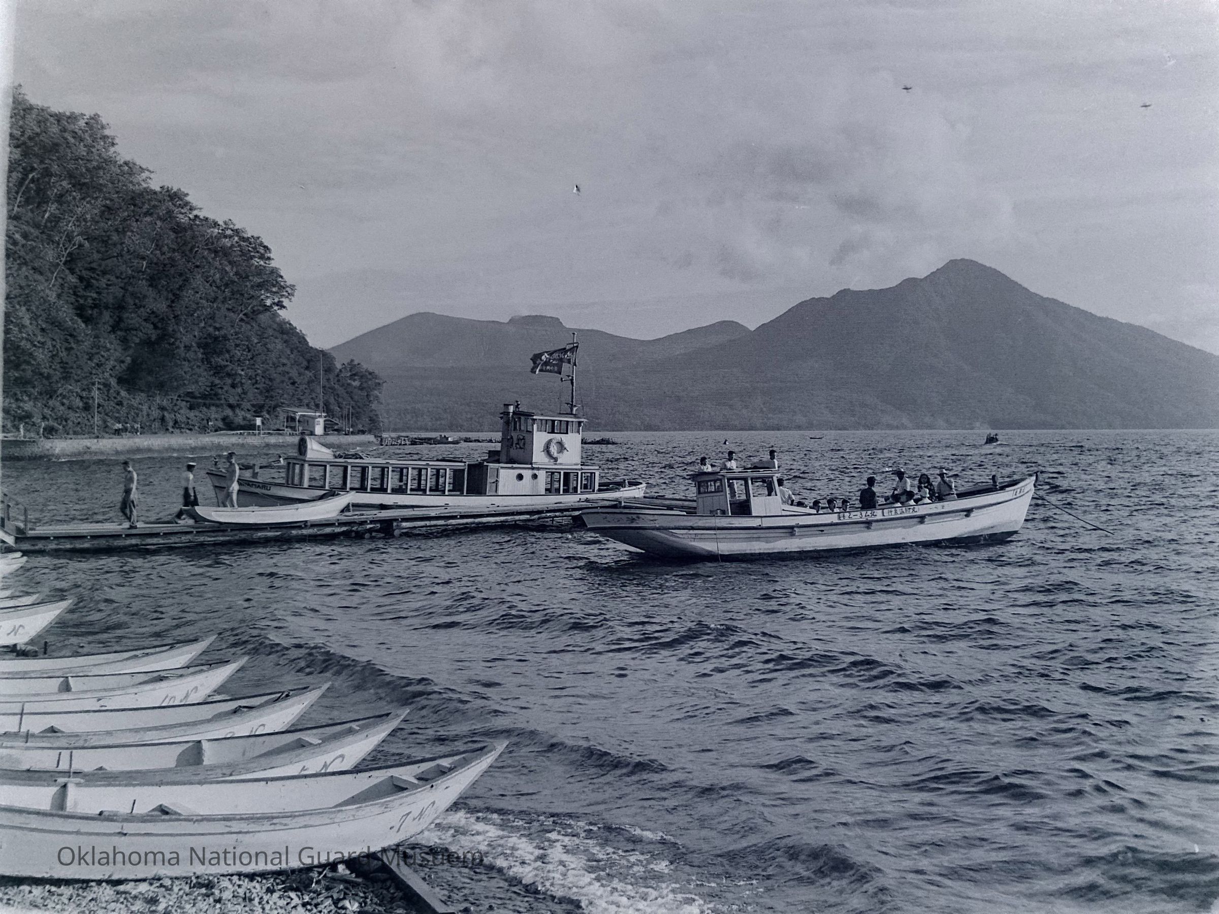 Negative of pleasure boats on shoreline on Hokkaido, Japan