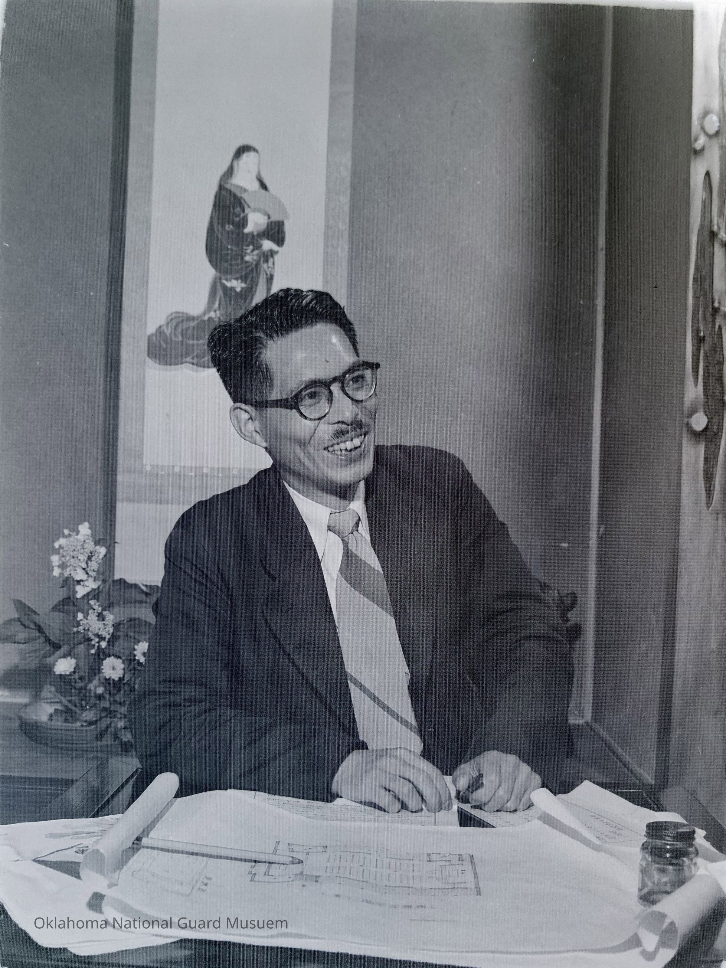 Negative of a portrait of Japanese man seated at desk on Hokkaido, Japan