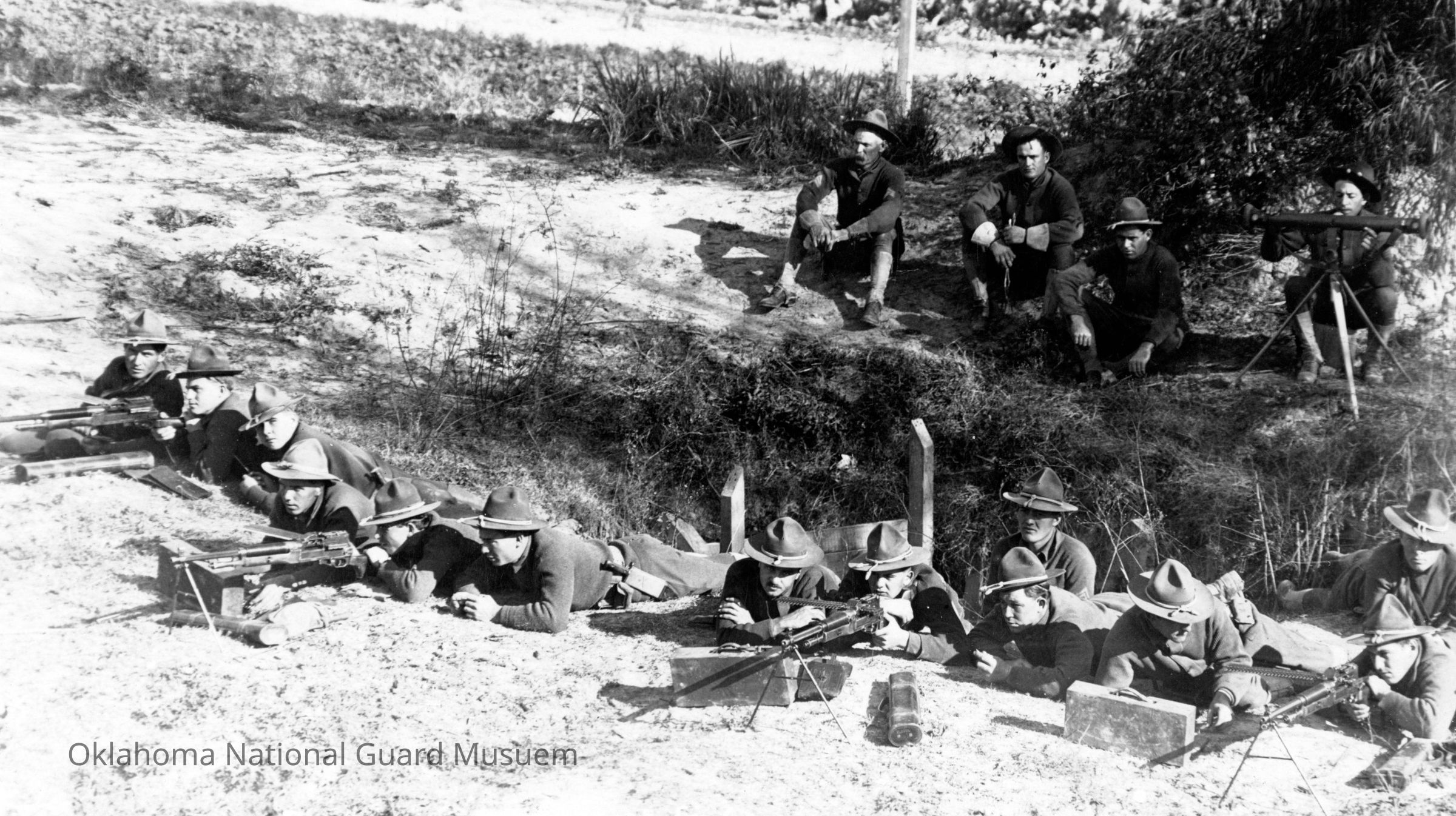 Postcard photo of a group of Oklahomans training with a Benet-Merce machine gun