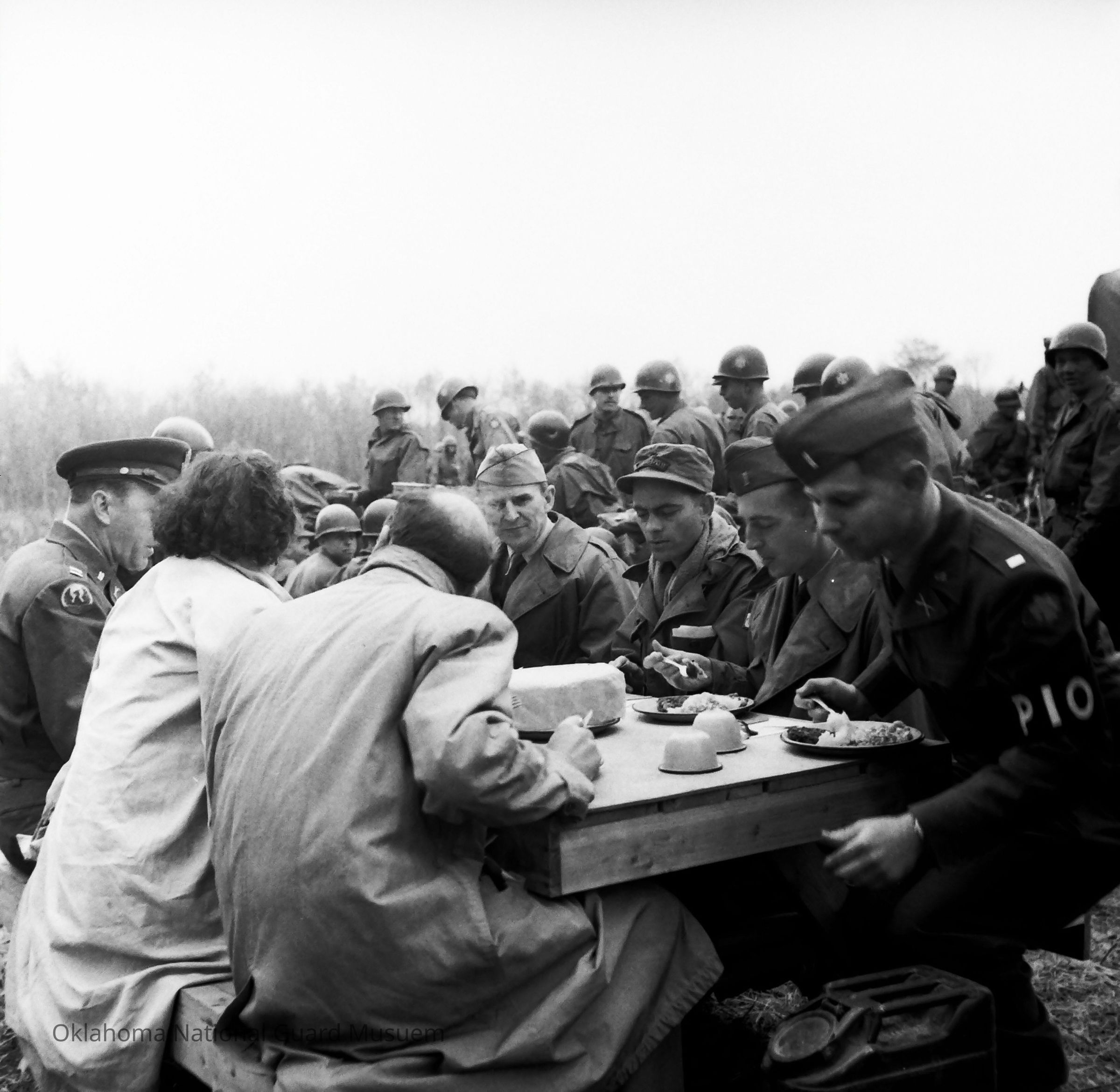 Negative of a Press Information Officer eating outdoors with a large group of soldiers and civilians