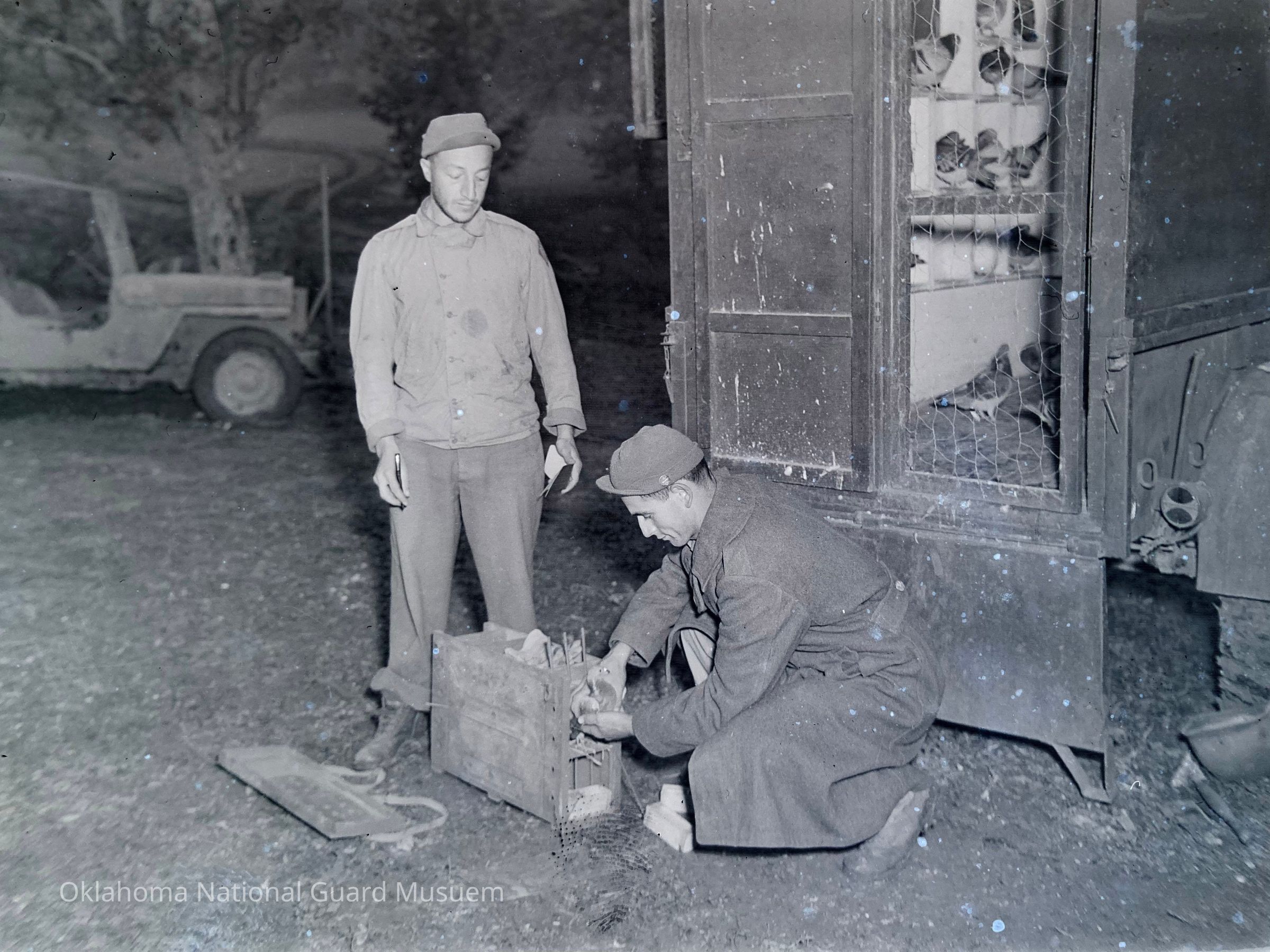 Published in the 45th Division News, 18 December 1943, Vol. IV, No. 23, Caption "Off to the front go 4 pigeons in a patrol's bird box. Placing the critters in the container is Pfc. Ralph Belhumeur, while Pfc. John Deverso stands by with the record book to register the flight."Made/Created