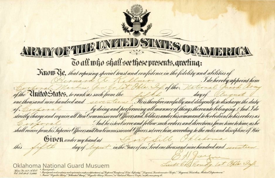 Promotion to Corporal for Bernard Alexander Kellner, Machine Gun Company First Oklahoma Infantry