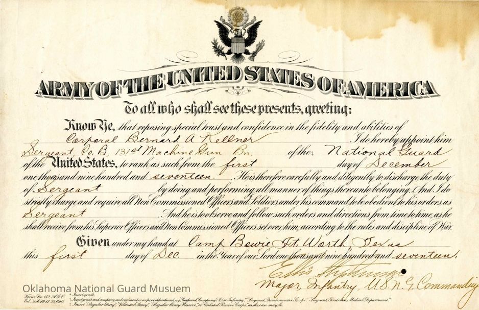 Promotion to Sergeant for Bernard Alexander Kellner, Company B 131st Machine Gun Battalion
