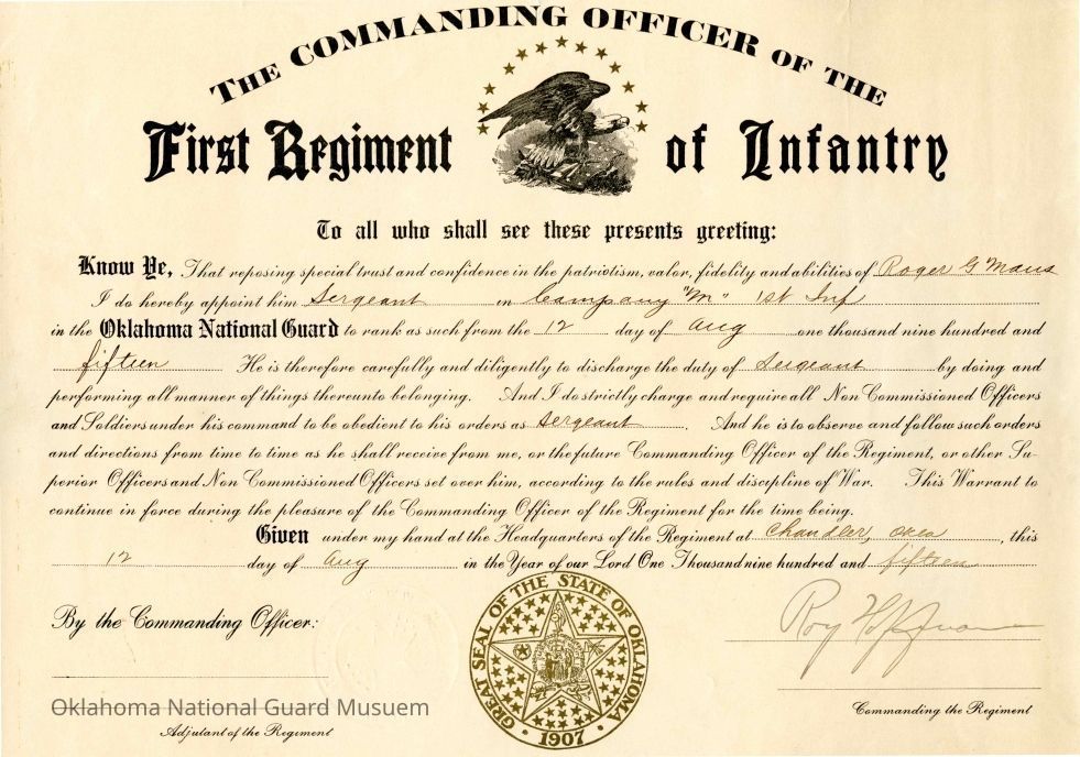 Promotion of Roger G Maus to Sergeant in Company M Forst Oklahoma Infantry. Signed by Roy Hoffman
