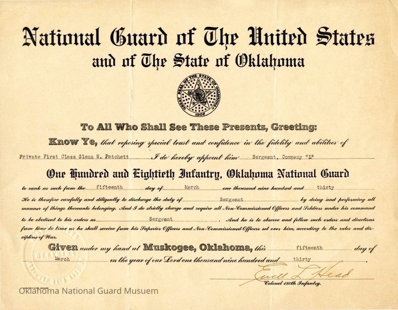 Promotion to Sergeant for Glen W Patchett of Company L 180th Infantry