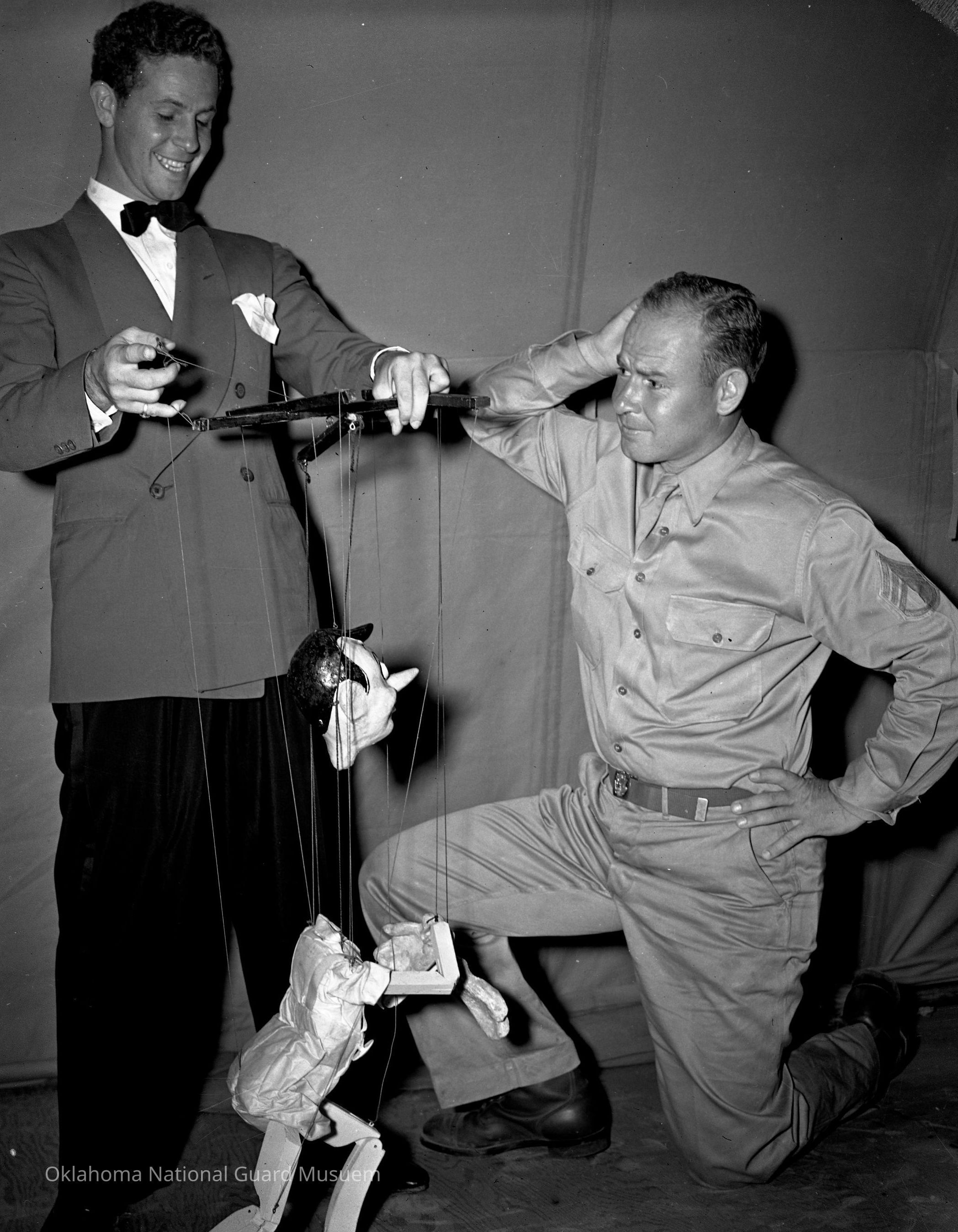 Negative of a puppeteer performing for a soldier