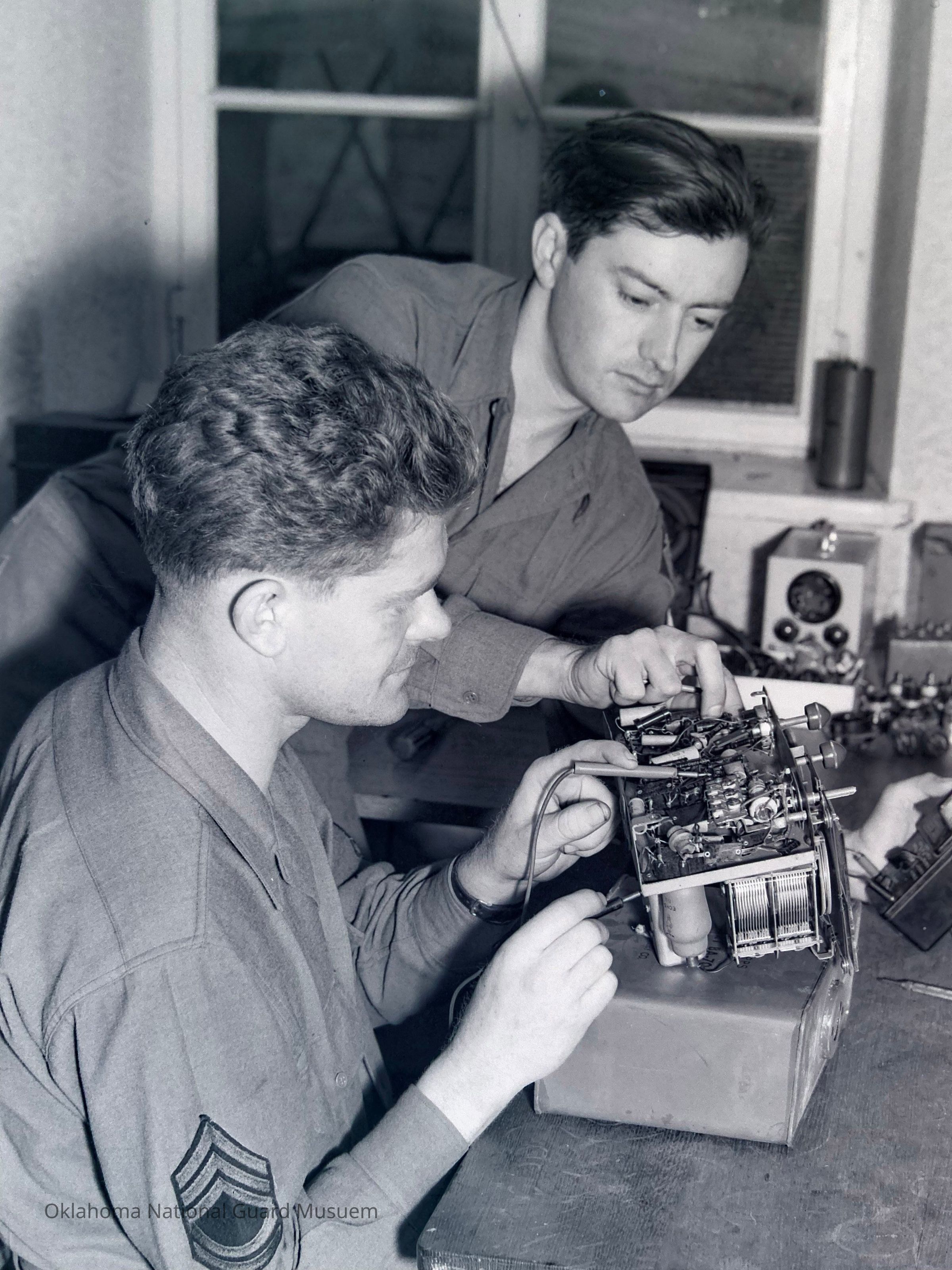 Negative of soldiers repairing a radio