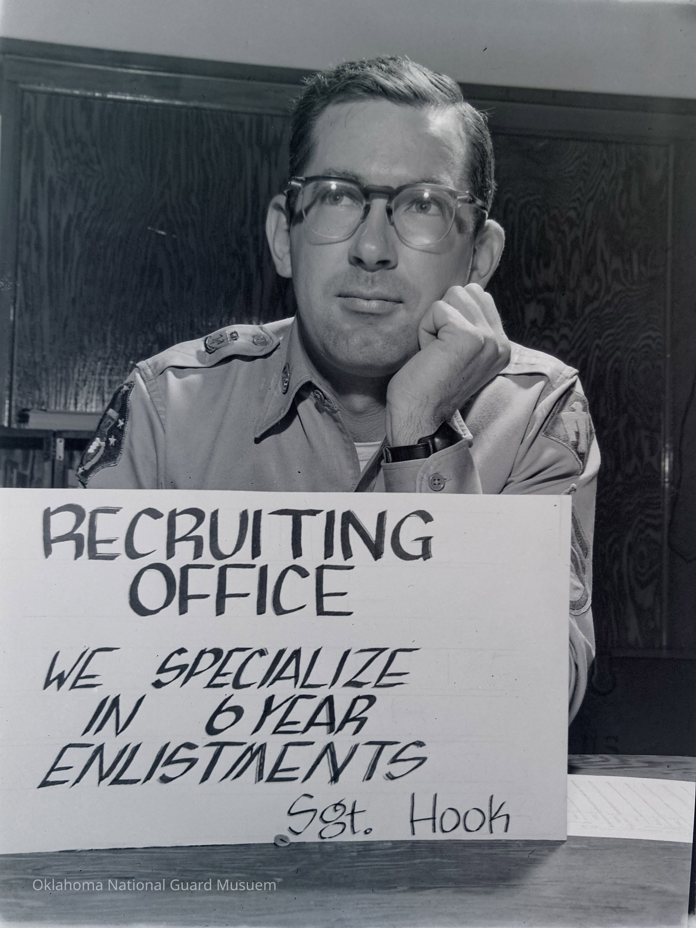 Negative of a recruiter sitting at desk behind sign on Hokkaido, Japan. "We Specialize in 6 Year Enlistments - Sgt. Hook"