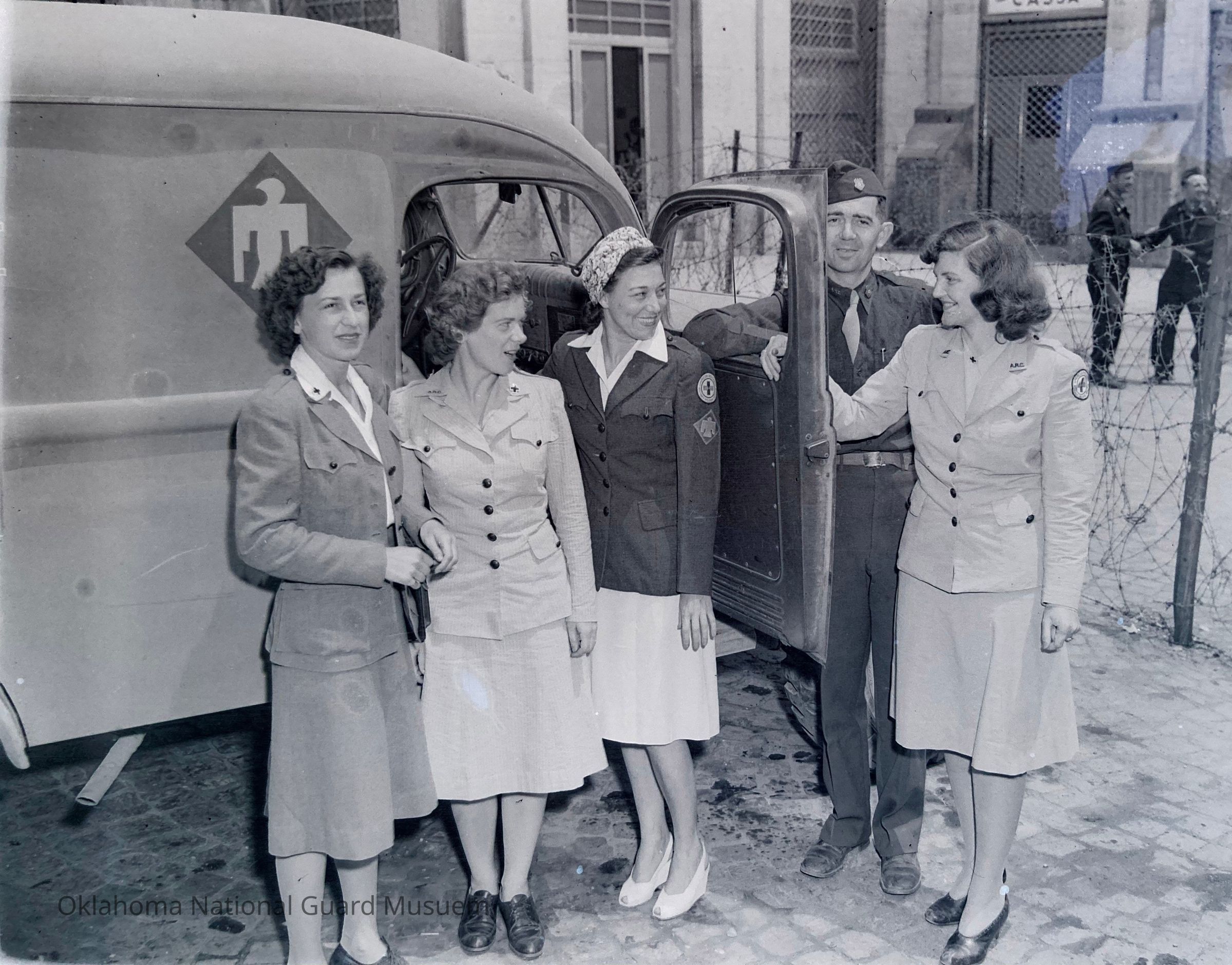 Photograph published in the 45th Division News, 22 June 1944, Vol. IV, No. 42, Caption, "The 45th not only has a new Clubmobile but also three new recruits. The crew (left to right): Sally Stauffer, Lancaster, PA; Elizabeth Peters, Cincinnati, OH; Betty Jones, Oklahoma City, OK; Monica Wood, Troy, NY, and Charles Petty, Durham, NC." Miss Jones and Petty joined the 45th in 1943. All, except Jones, served with the 45th until it returned to the United States.Made/Created