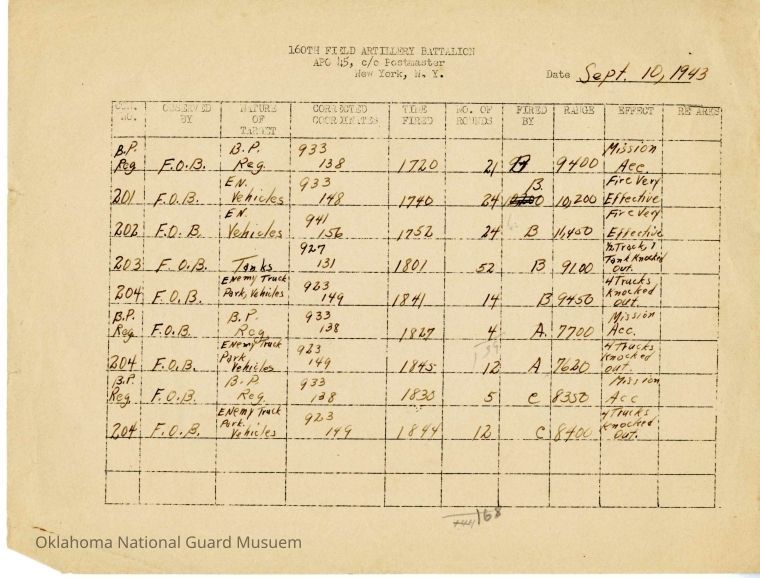 160th Field Artillery Report of Fire Operations during the Italian Campaign. This report covers September 10, 1943- Dec 31, 1943. The report details the grid coordinates, number and types of rounds fired, the range, and the time of firing.Lexicon