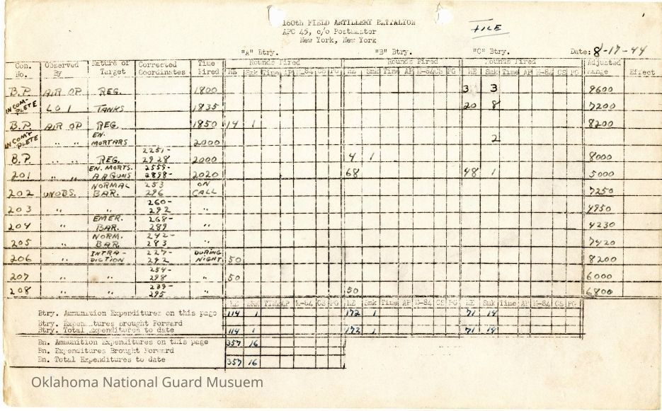 160th Field Artillery Report of Fire Operations during the French Campaign. This report covers August 17, 1944- December 31, 1944. The report details the grid coordinates, number and types of rounds fired, the range, and the time of firing.Context
