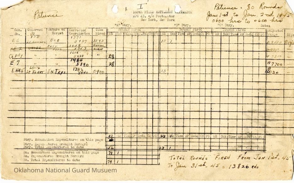 160th Field Artillery Report of Fire Operations. This report covers Jan 1, 1945- February 18, 1945. The report details the grid coordinates, number and types of rounds fired, the range, and the time of firing.Context