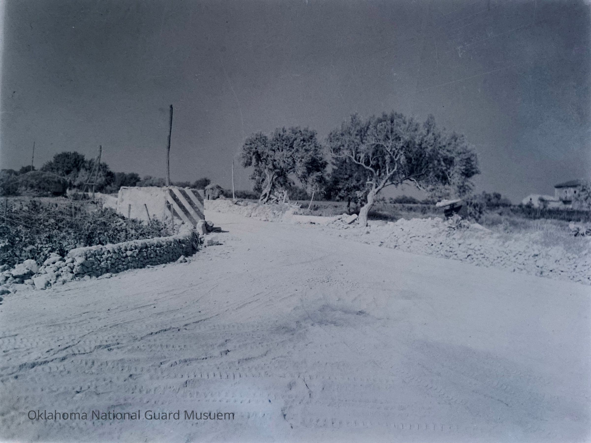 Negative of a road junction with remains of Italian pillbox