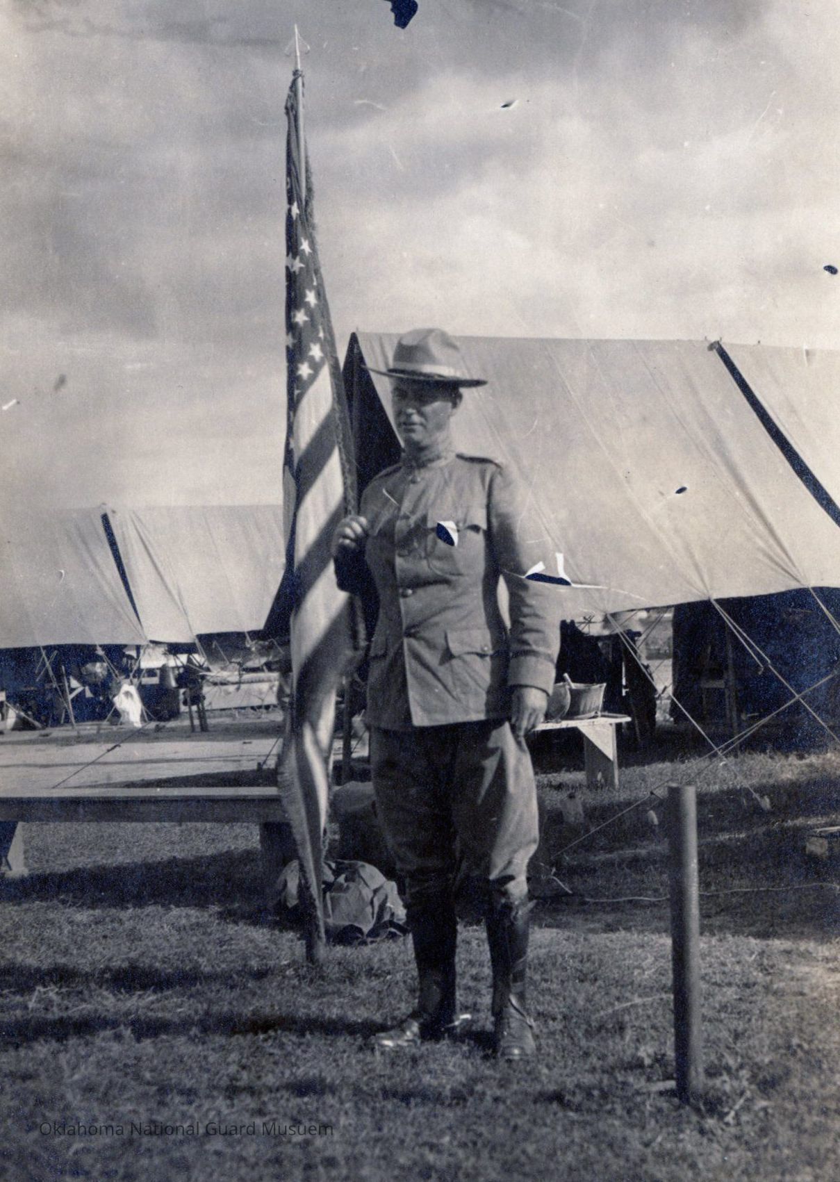 Roy Hoffman standing in front of an American flag in a tent encampment