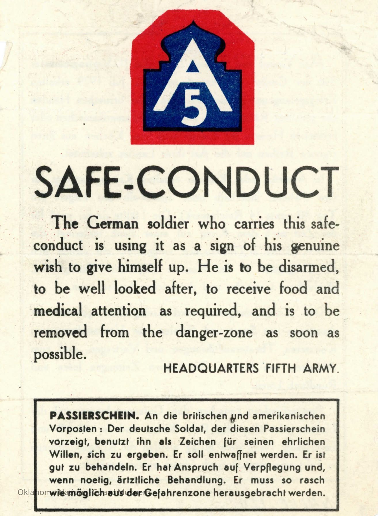 Fifth Army Safe Condict pass for German prisoners of war to carry upon surrenderingMade/Created
