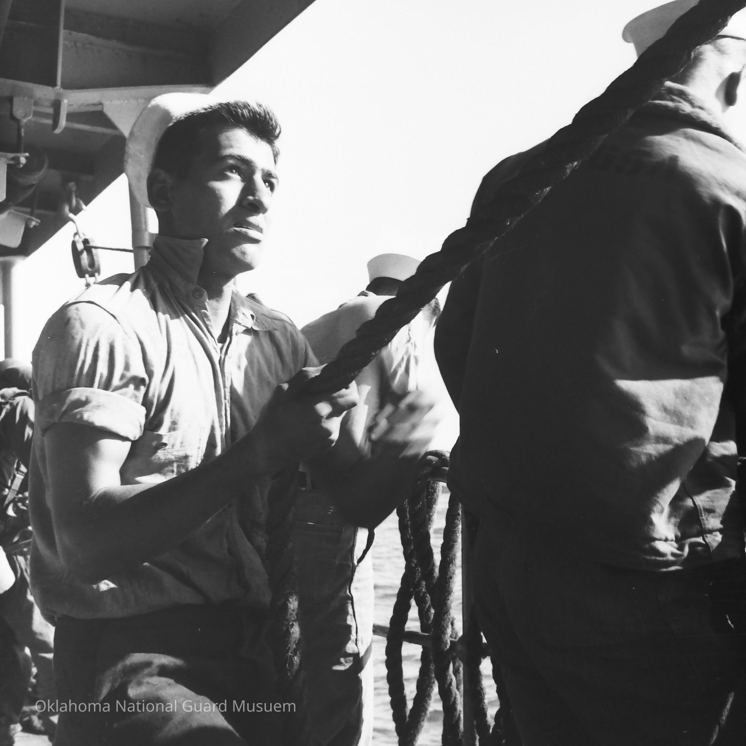 Negative of a sailor handling shipboard lines