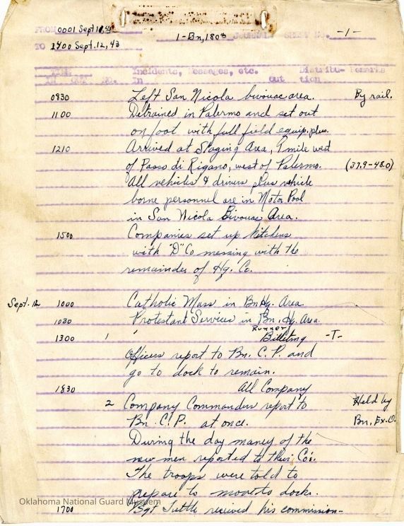 Daily journal of First Battalion 180th Infantry in the Salerno Campaign. Compiled by Clyde Hoestetler- Battalion Sergeant Major