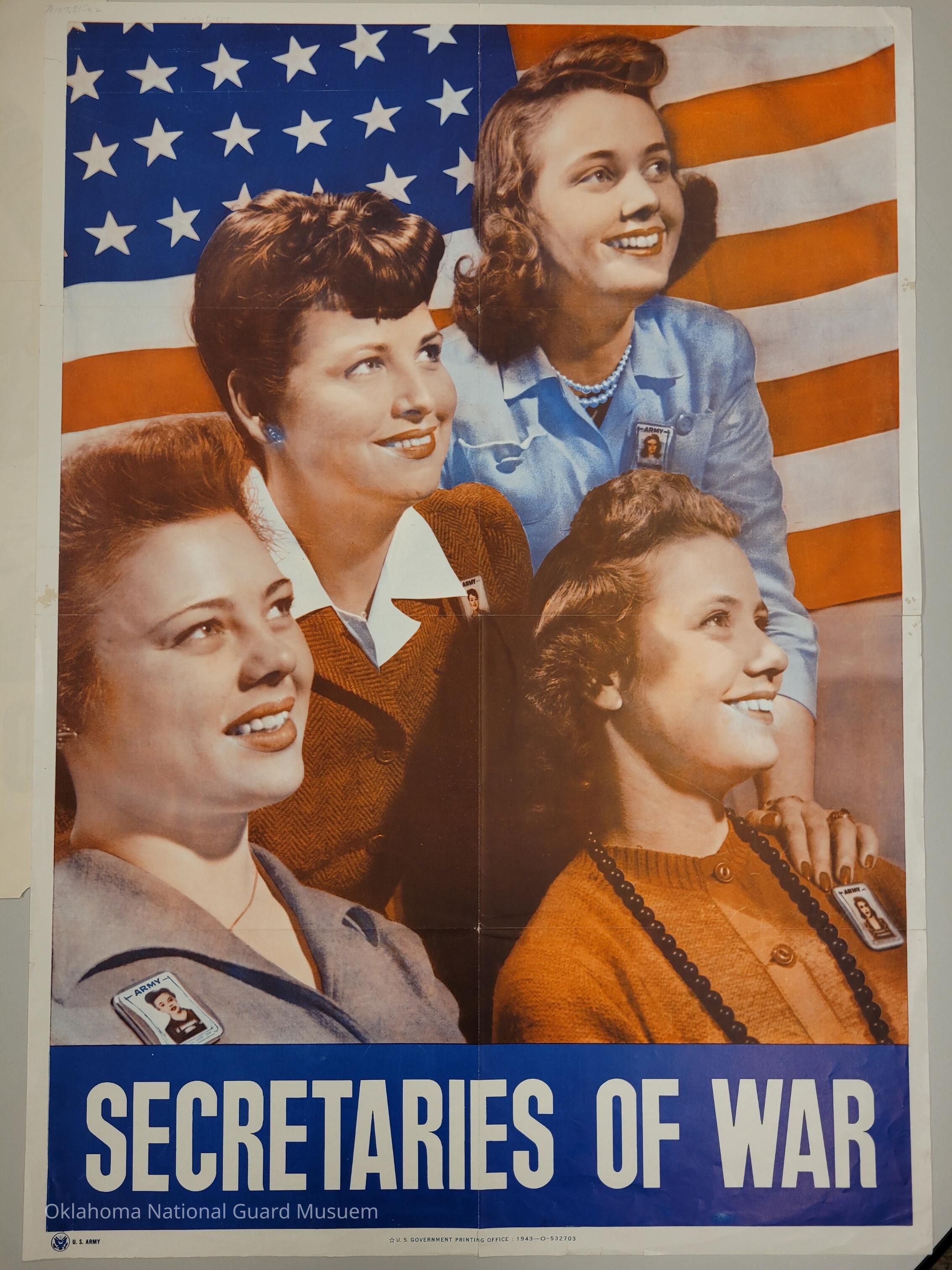 United States Army poster with an illustration of four women posing in front of a U.S. flag. The women are wearing Army identification badges on their shirtsCollection