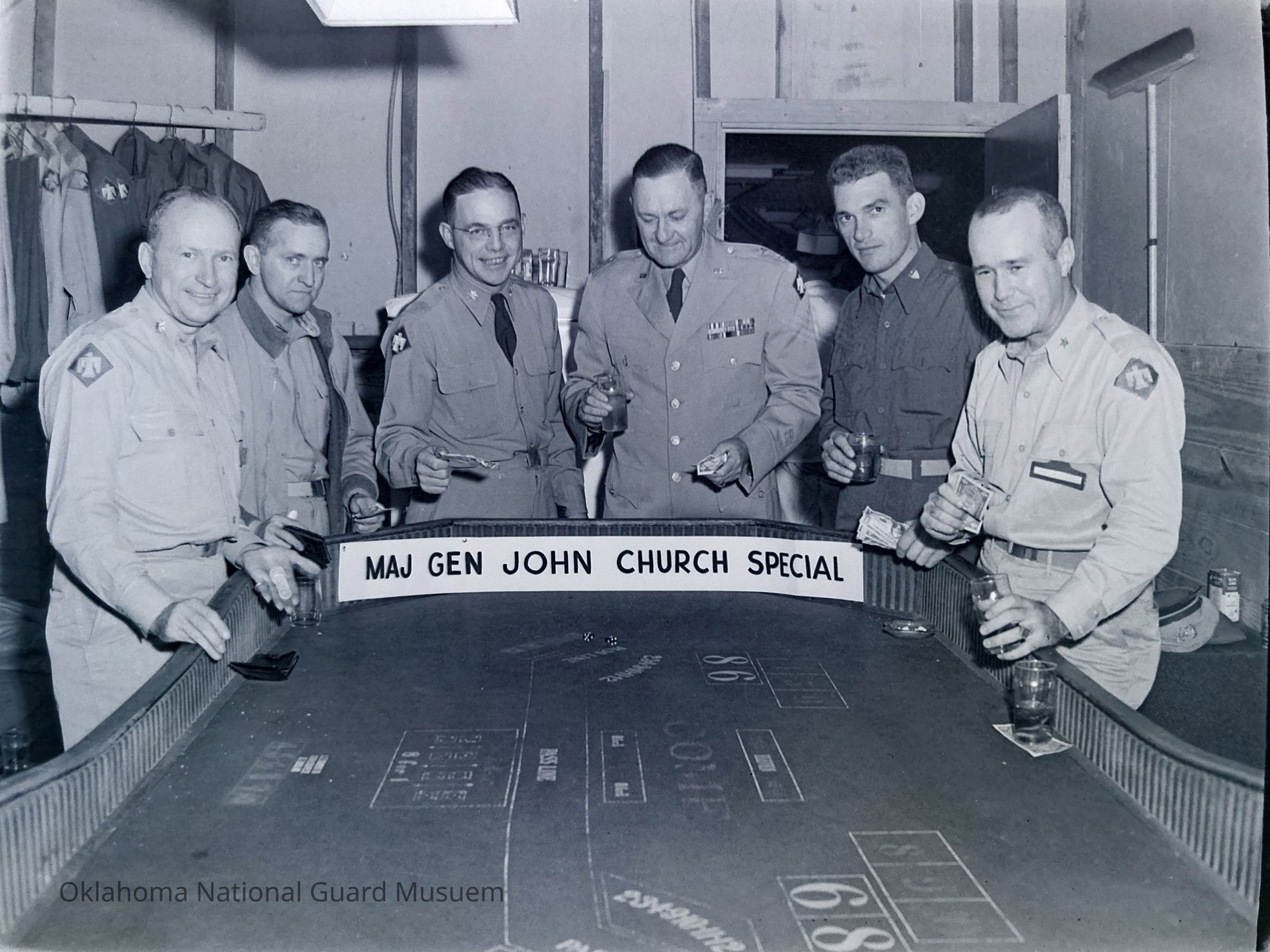 Negative of Several officers gathered around a craps table enjoying a drink and a little gambling. Table is labeled "Maj Gen John Church Special" Alvin Wood, James Bratton, Ed Johndrow, William Cook, Styron, Woodrow Cook, George Fisher all present in Hokkaido, JapanPhotograph Details