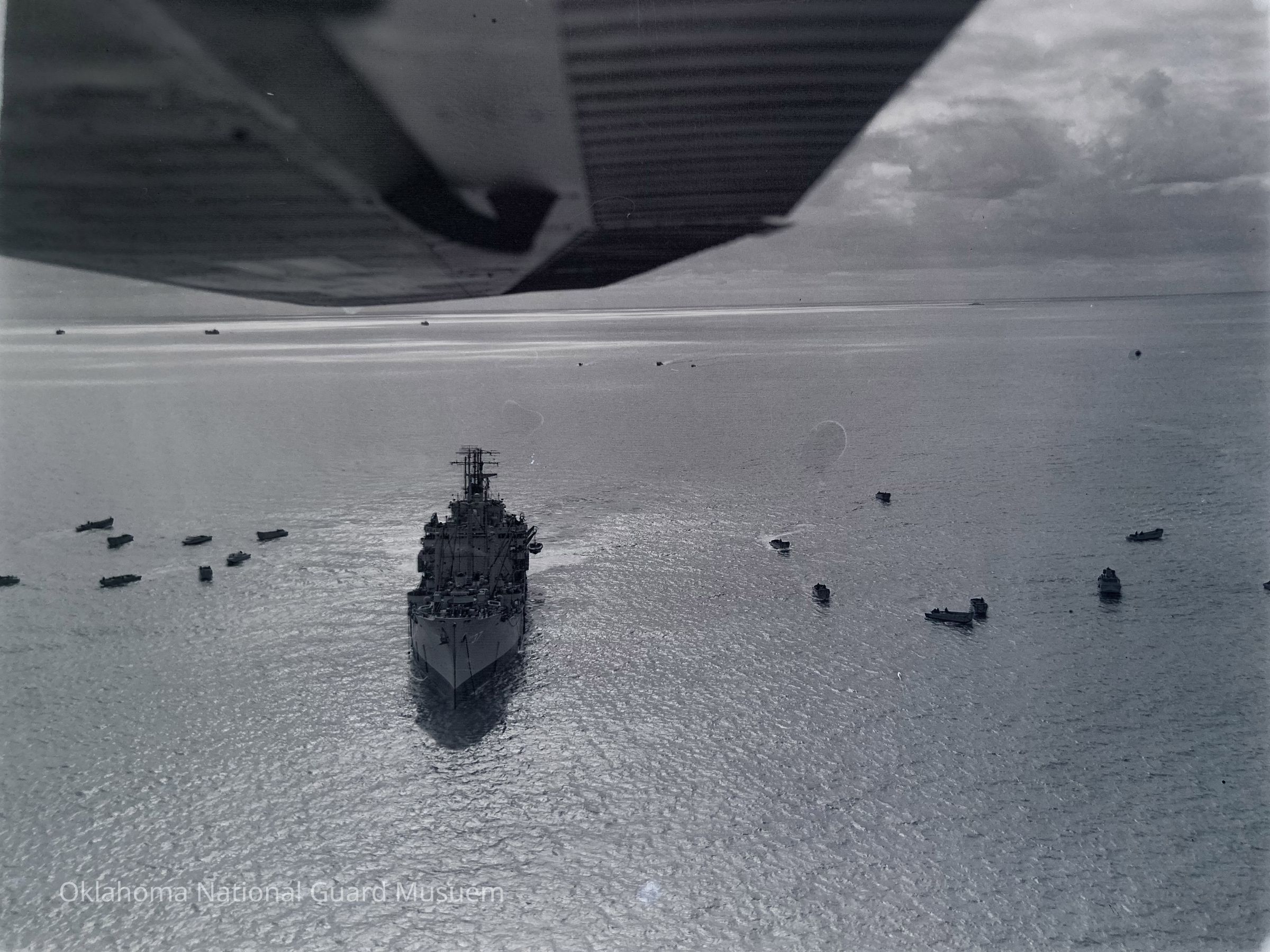 Negative of ship at sea surrounded by landing craft off the coast of Japan.