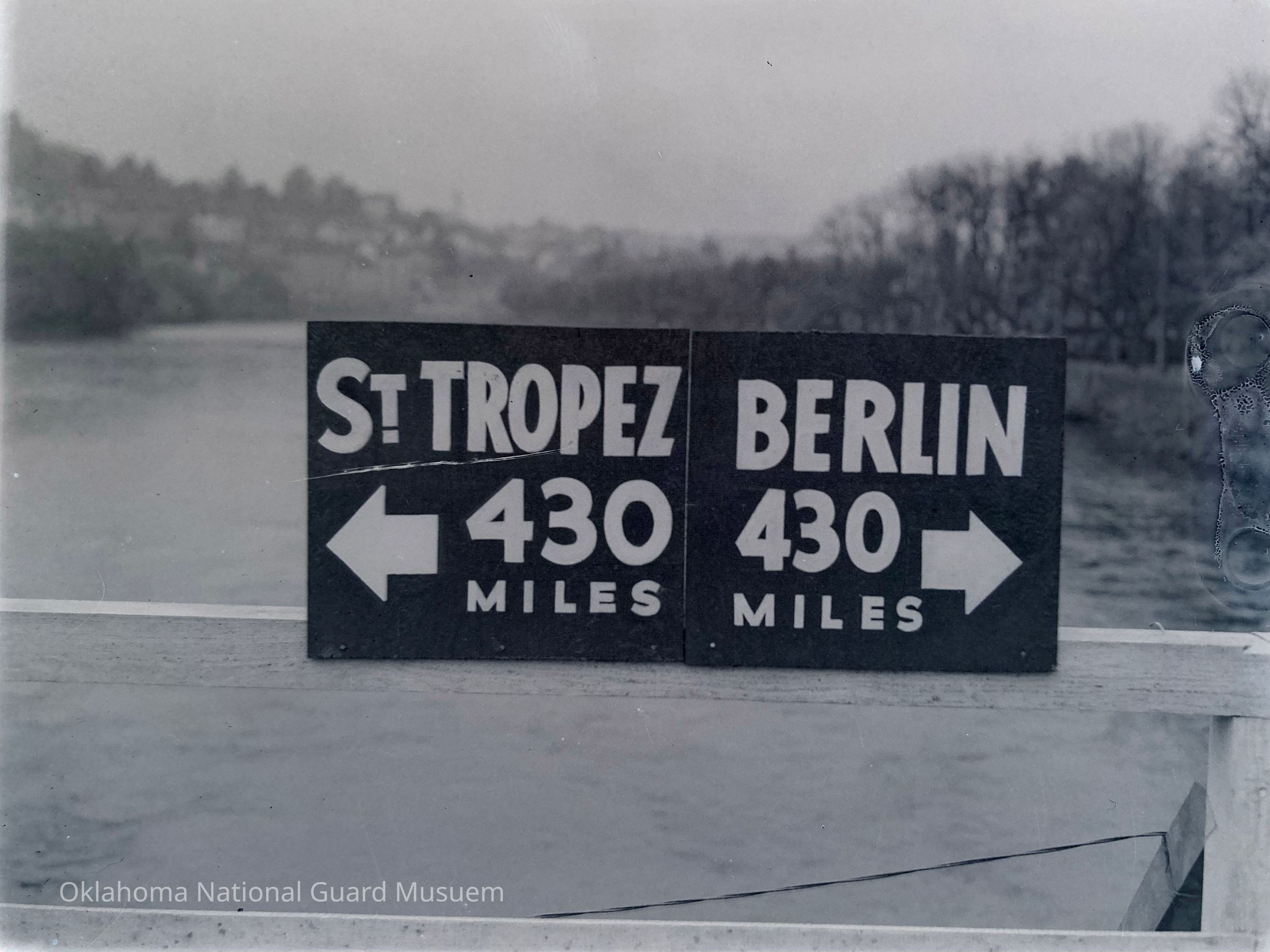 Negative of a sign erected by 120th Engineers signaling halfway point between Southern France landings at Saint-Tropez and Berlin