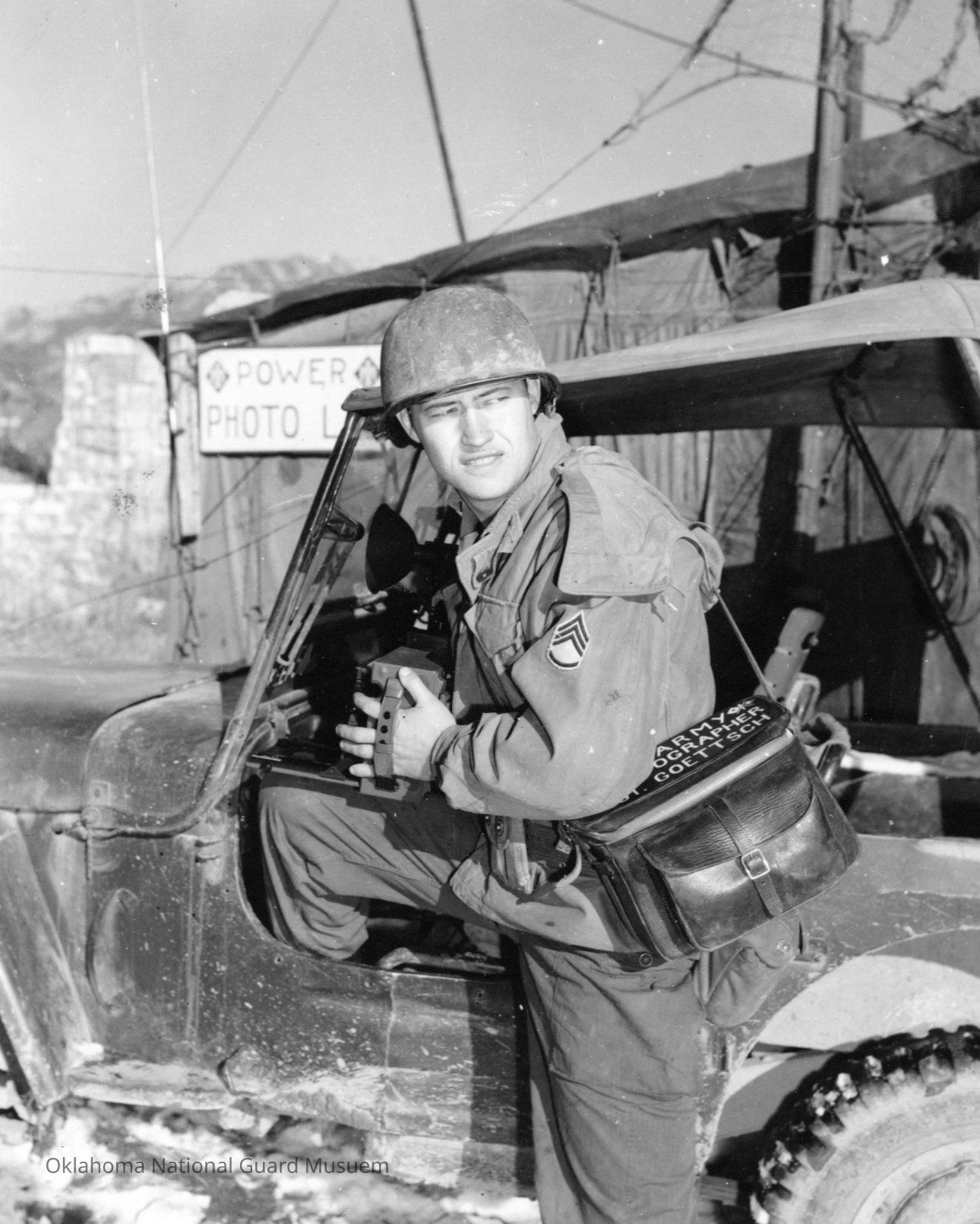 45th Signal Corps photographer Auggie Goettsch (Iowa) taking his camera and camera bag to cover front line action