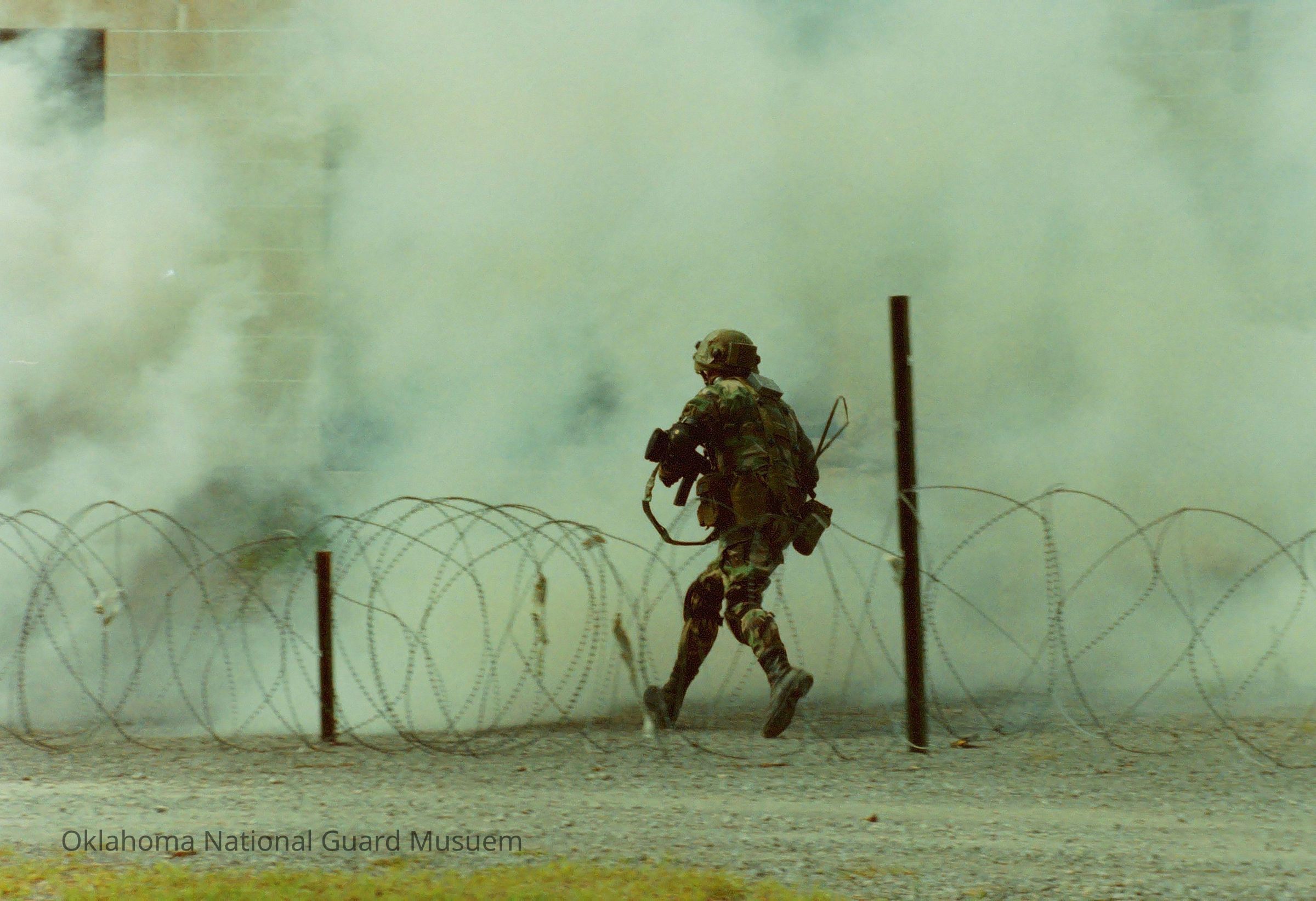 Negative of a soldier advancing through smoke in training village