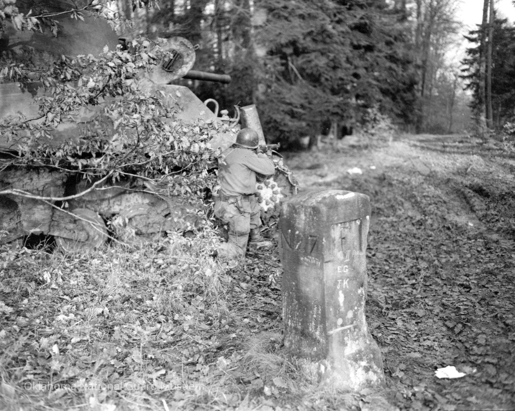 Soldier of Company K 180th Infantry aims his rifle from behind the cover of a tank on the German-French border