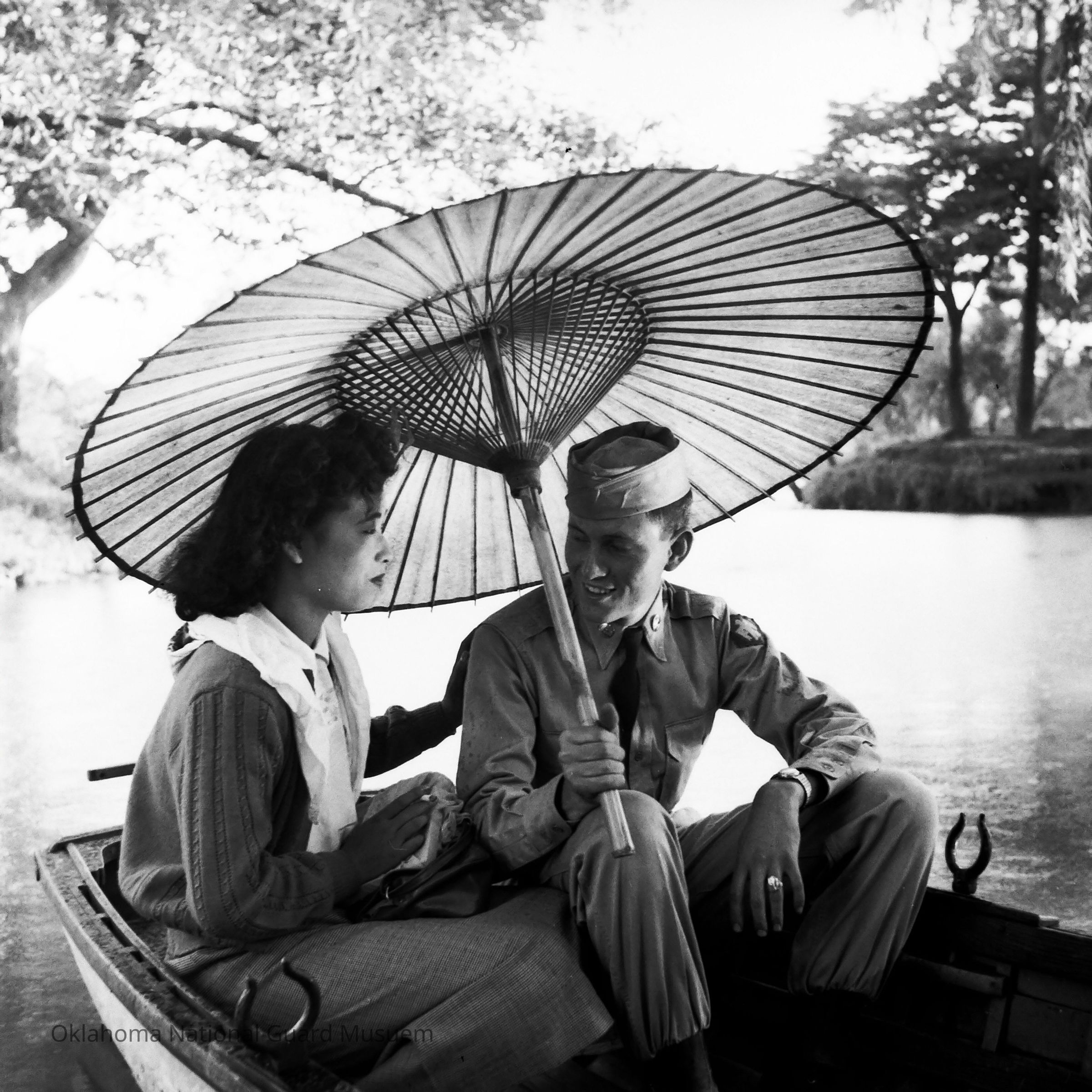 Soldier and a Japanese woman sharing a rowboat