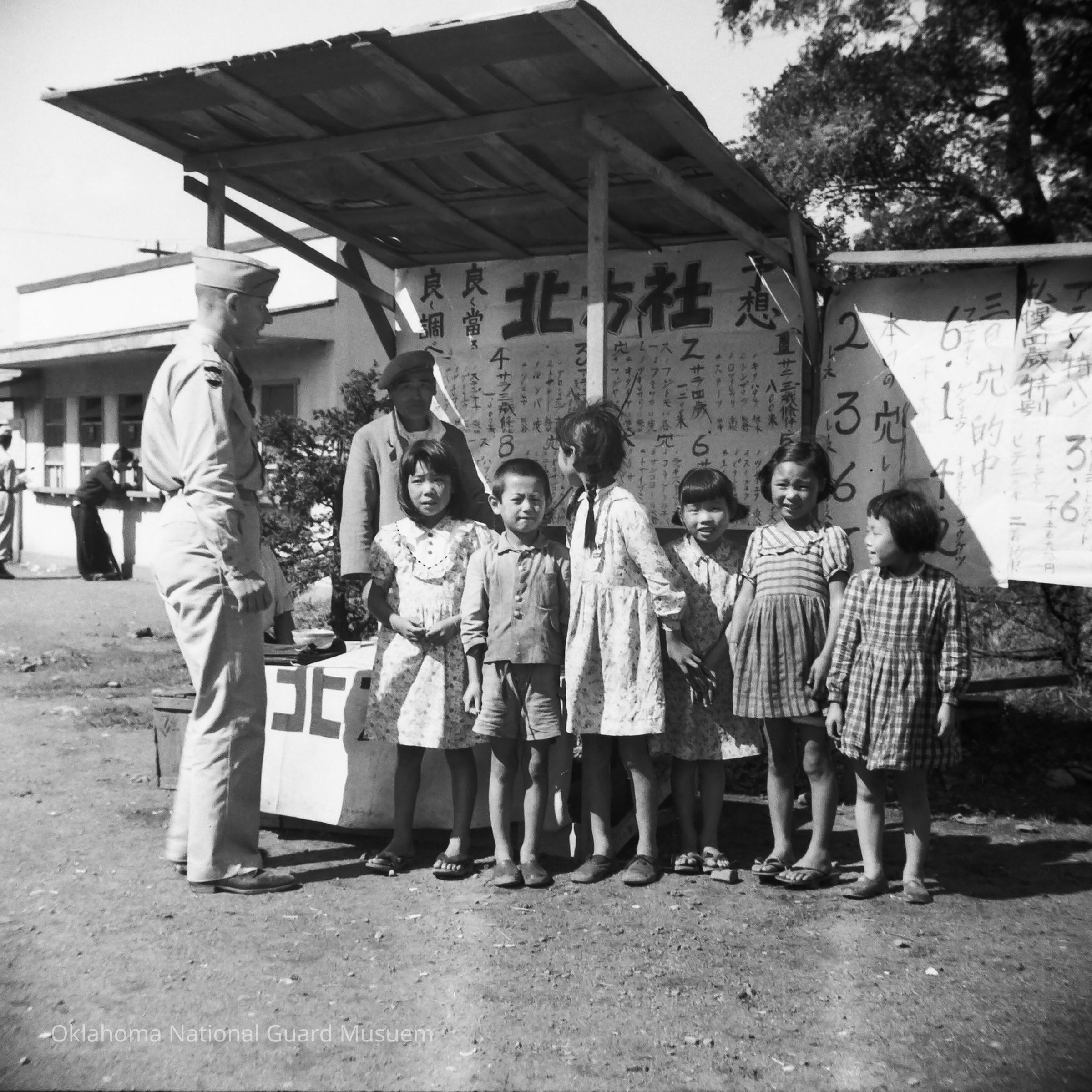 Negative of a soldier and group of children at a vendor's stall