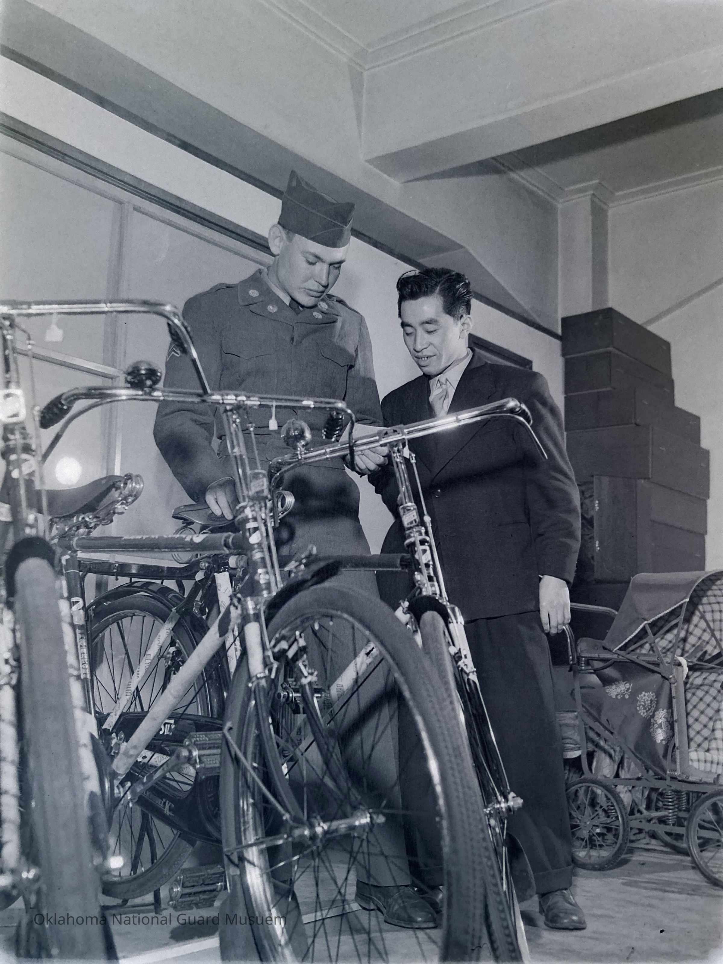 Negative of a soldier and Japanese civilian looking at new bicycles on Hokkaido, Japan