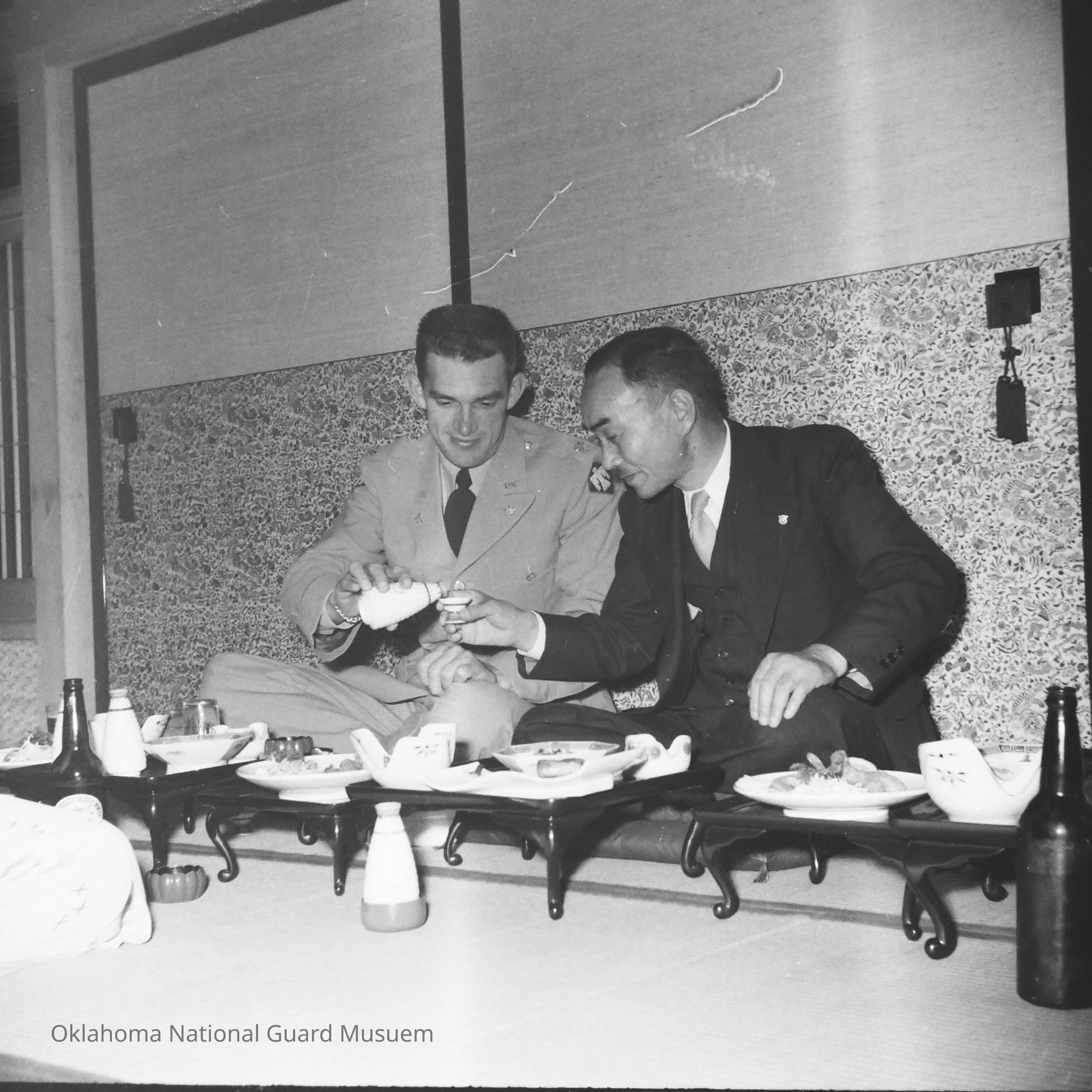 Soldier and Japanese man at a formal dinner
