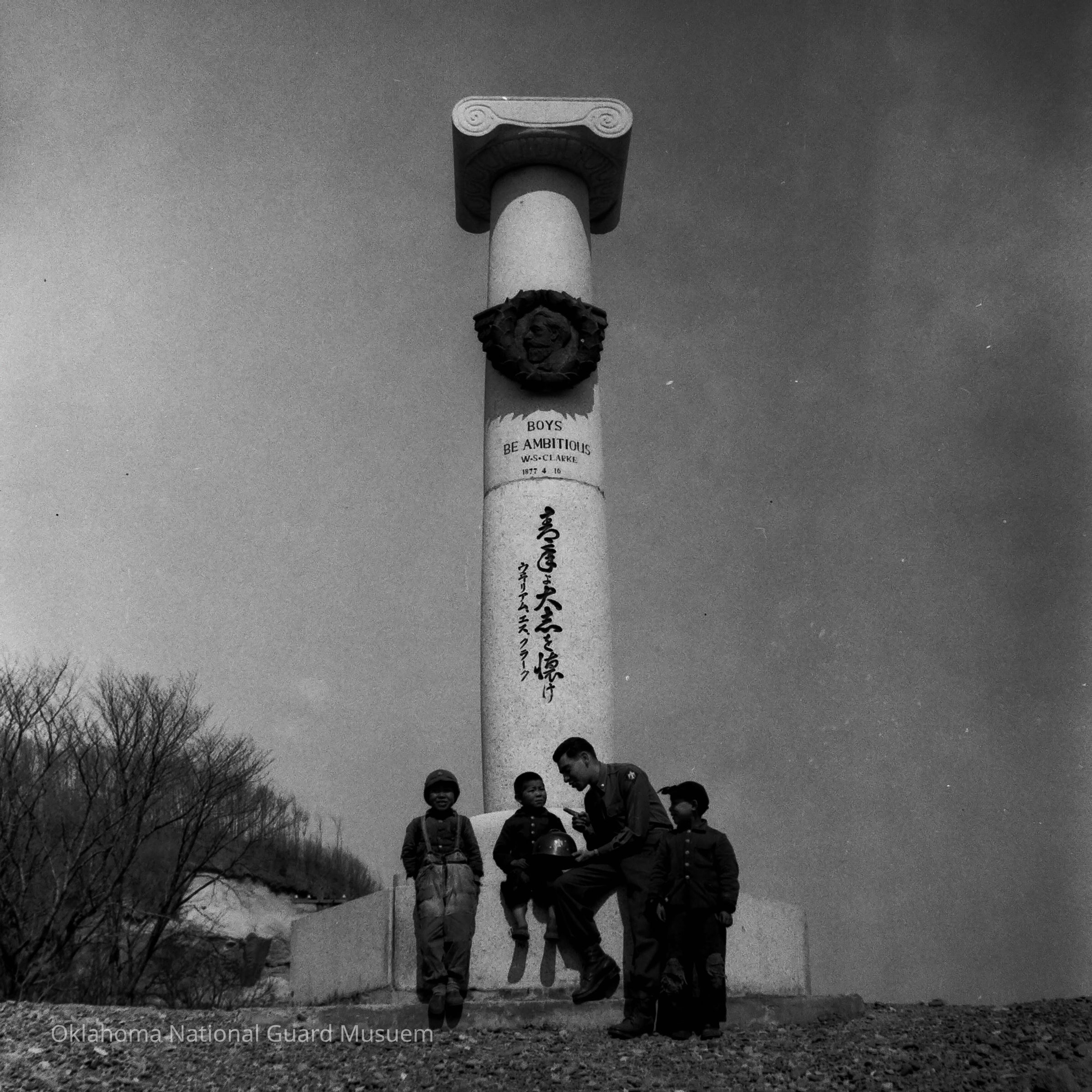 Soldier and kids in front of monument to W. S. Clark at Sapporo Agricultural College