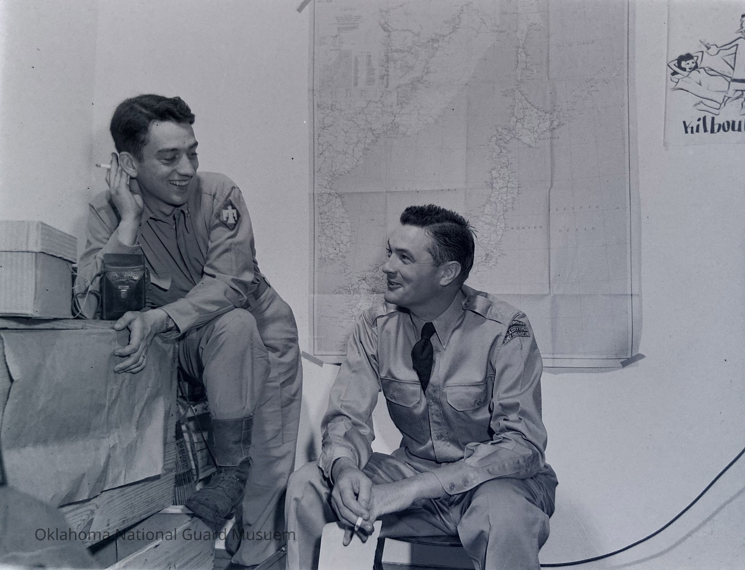 Negative of a soldier and newspaper reporter Wayne Mackey (right) in front of a wall map on Hokkaido, Japan. Shoulder patch reads "Correspondent Oklahoma City Times Daily Oklahoman"