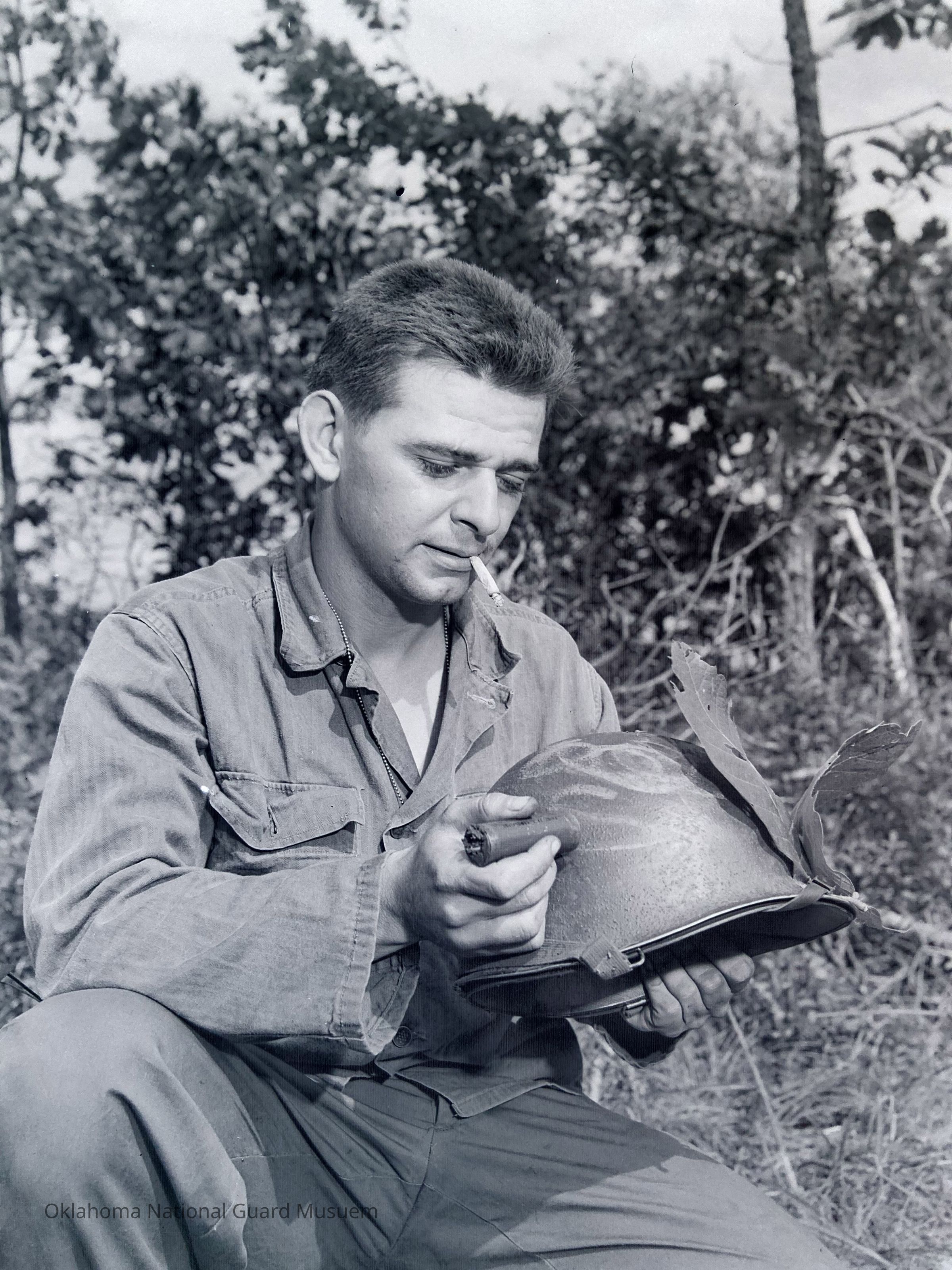 Negative of a soldier applying camouflage to his helmet on Hokkaido, Japan
