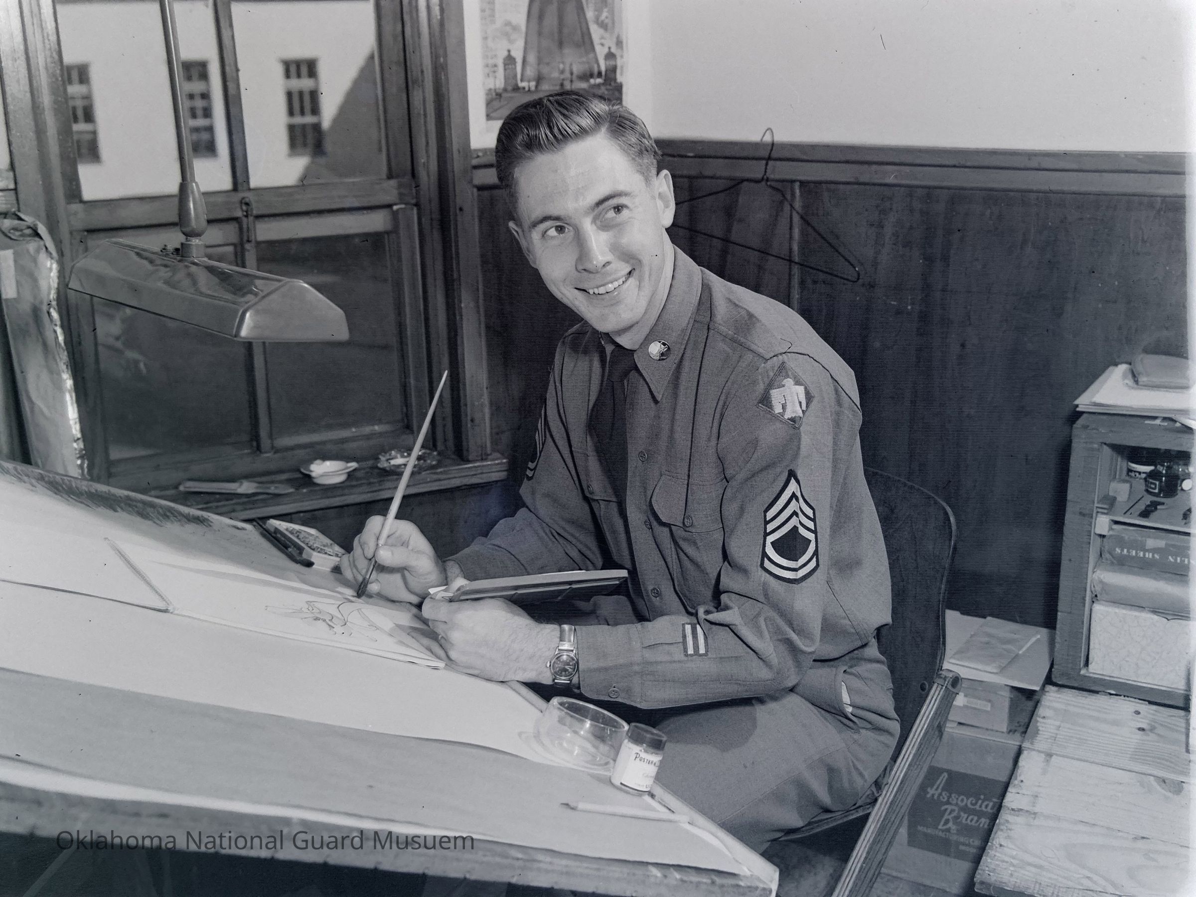 Negative of a soldier at drawing table on Hokkaido, Japan