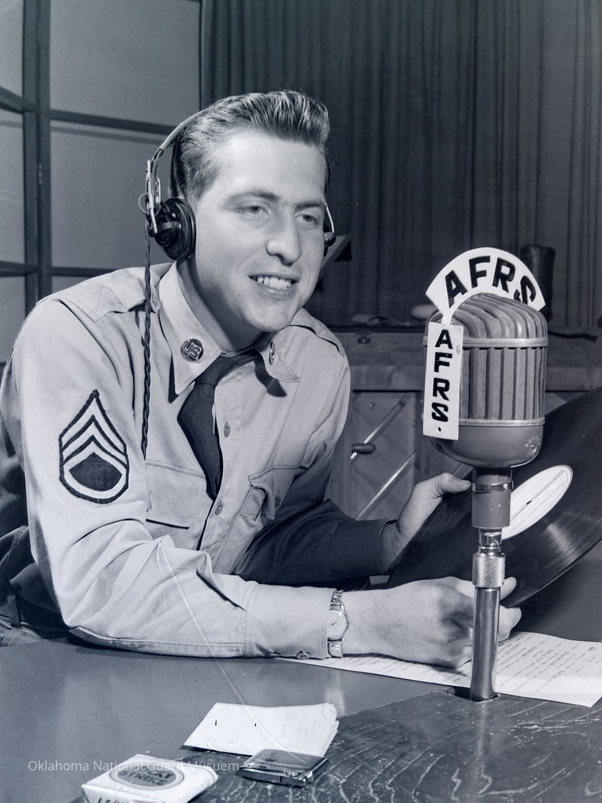 Negative of soldier at microphone for Armed Forces Radio Service on Hokkaido, Japan