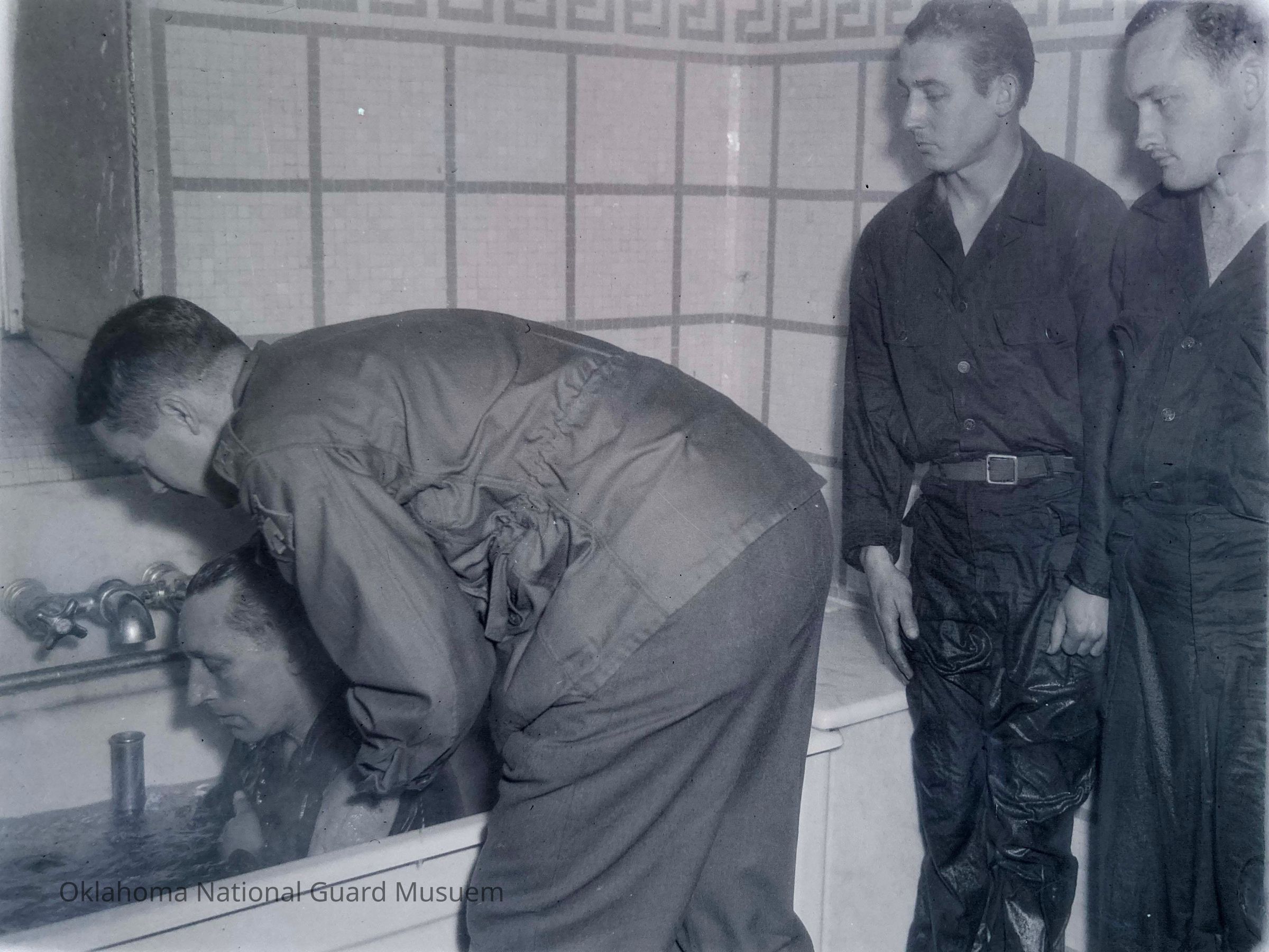 Negative of a soldier being baptized in bathtub
