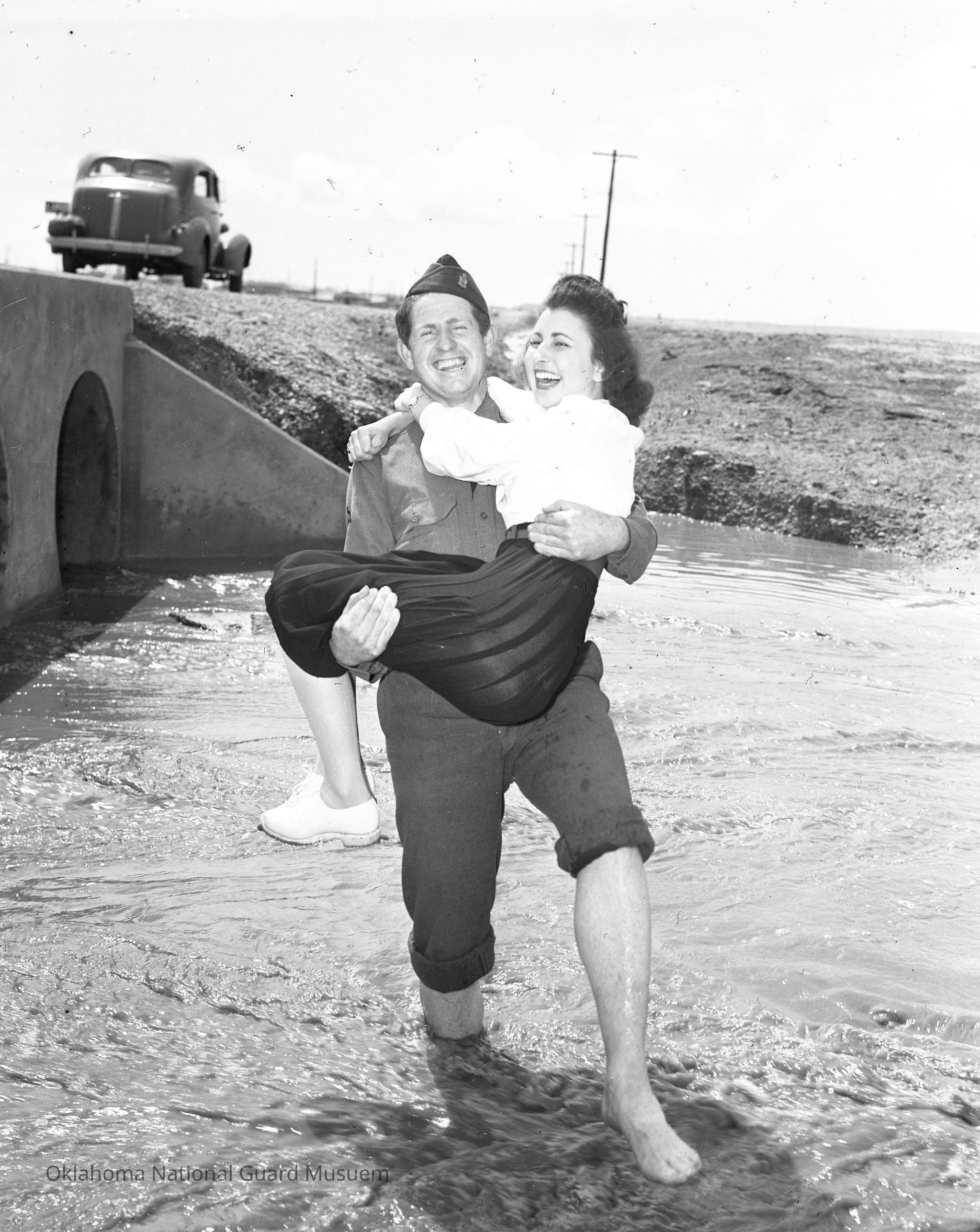 Negative of a soldier carrying a girl across a flooded drainage ditch