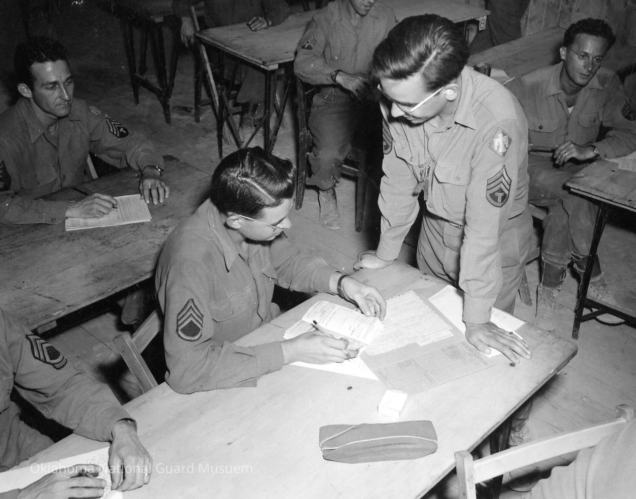 E.G. Keefer, Headquarters 45th Division (Monmouth, Illinois) checks service record of (standing) John P. Bellanti (Buffalo, New York)
