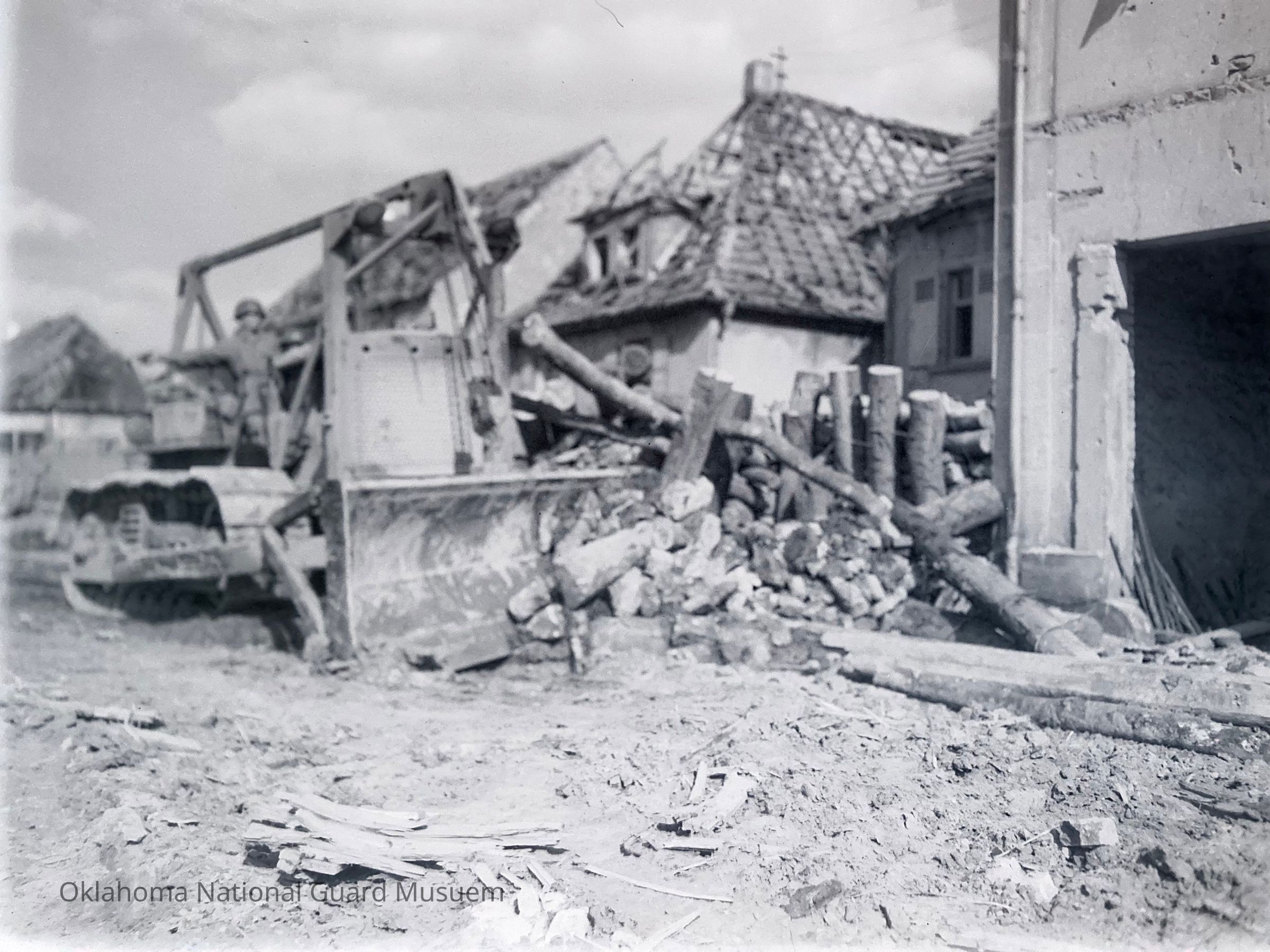 Negative of a soldier clearing debris with bulldozer. 120th Engineers