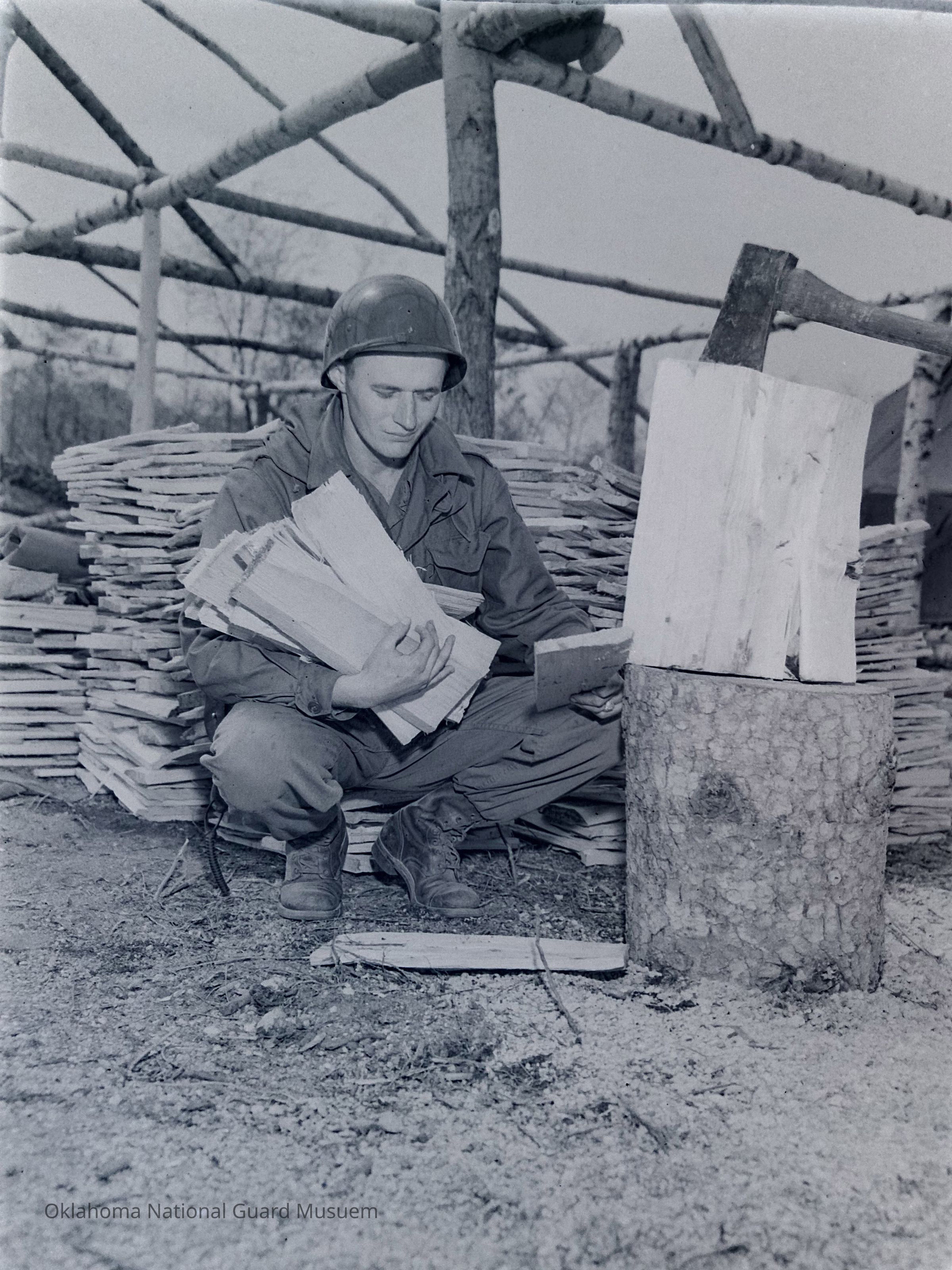 Negative of a soldier collecting split wood on Hokkaido, Japan