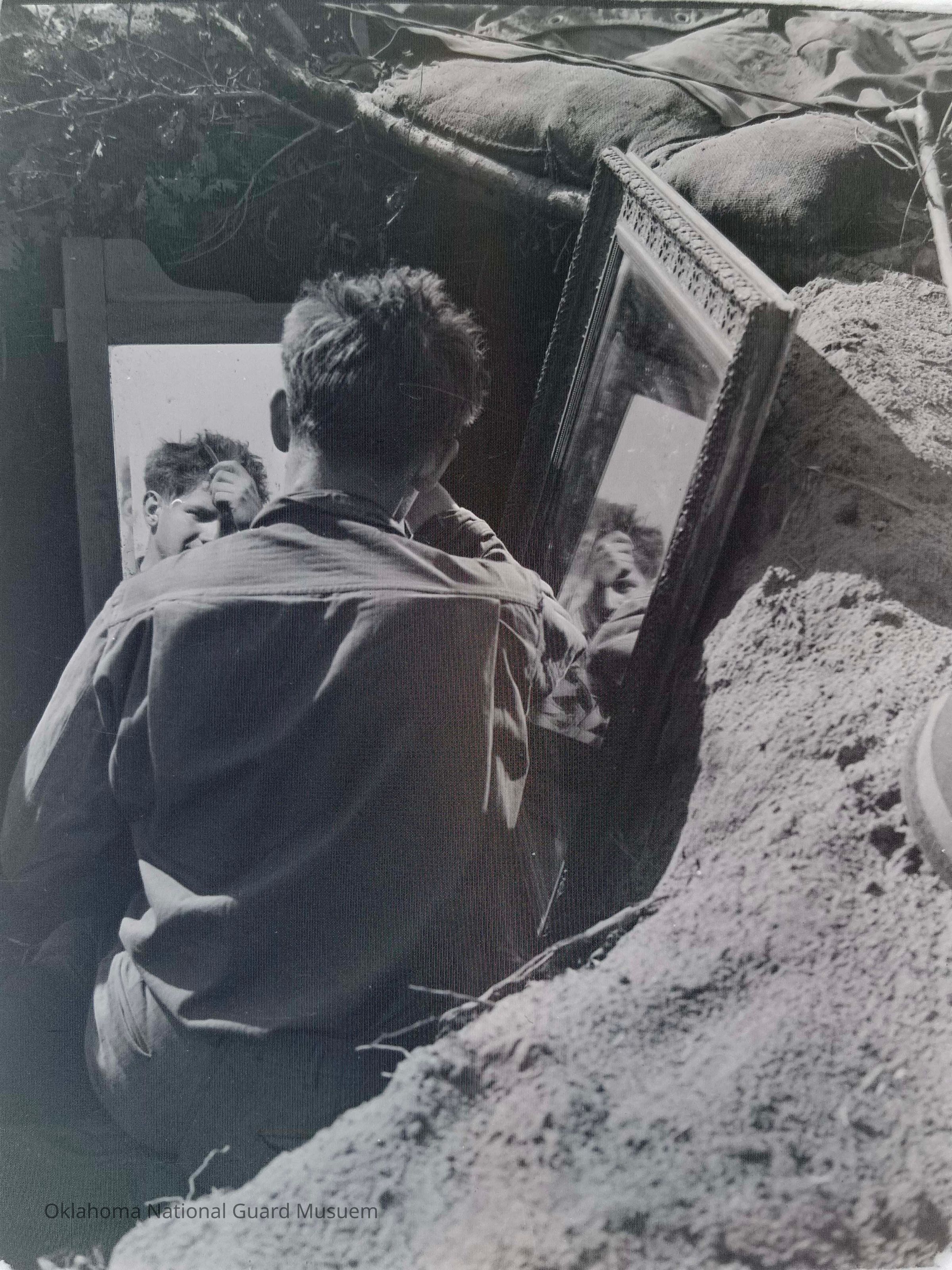 Photograph published in the 45th Division News, March 22, 1944, Vol. IV, No. 33, Caption "Complaining that he couldn't comb his hair without a mirror, Pvt. Gordon Albertson, artilleryman from Camden, NJ, was fixed up pretty quickly with two big ones of the boudoir variety. He's shown prettying up his head somewhere on the beachhead."Made/Created