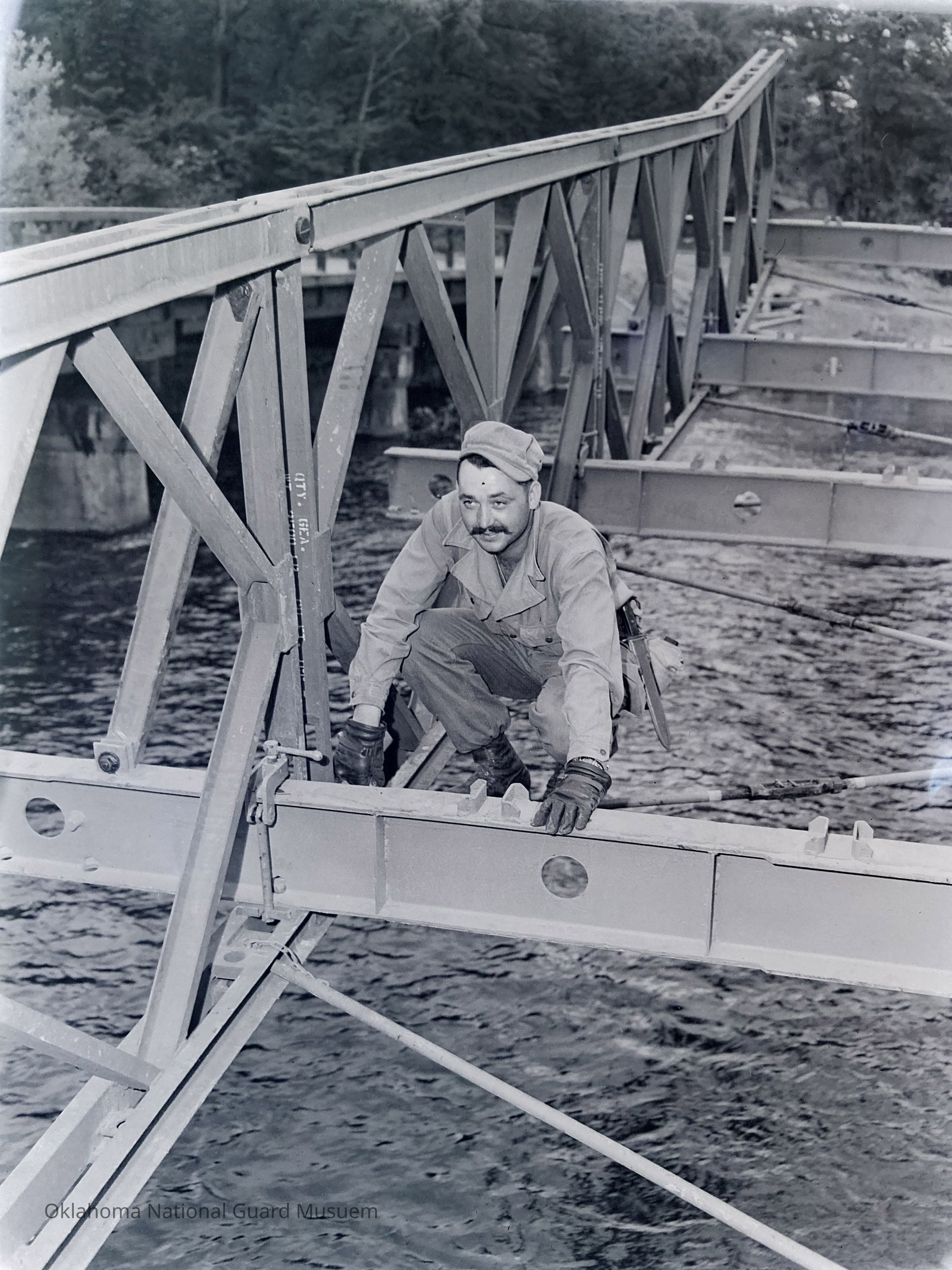45th Division News Vol. VI No. 29 "Frank Hausmann, Company B 120th Engineers, climbs on the steel framework of the Bailey Bridge spanning the Chitose River."