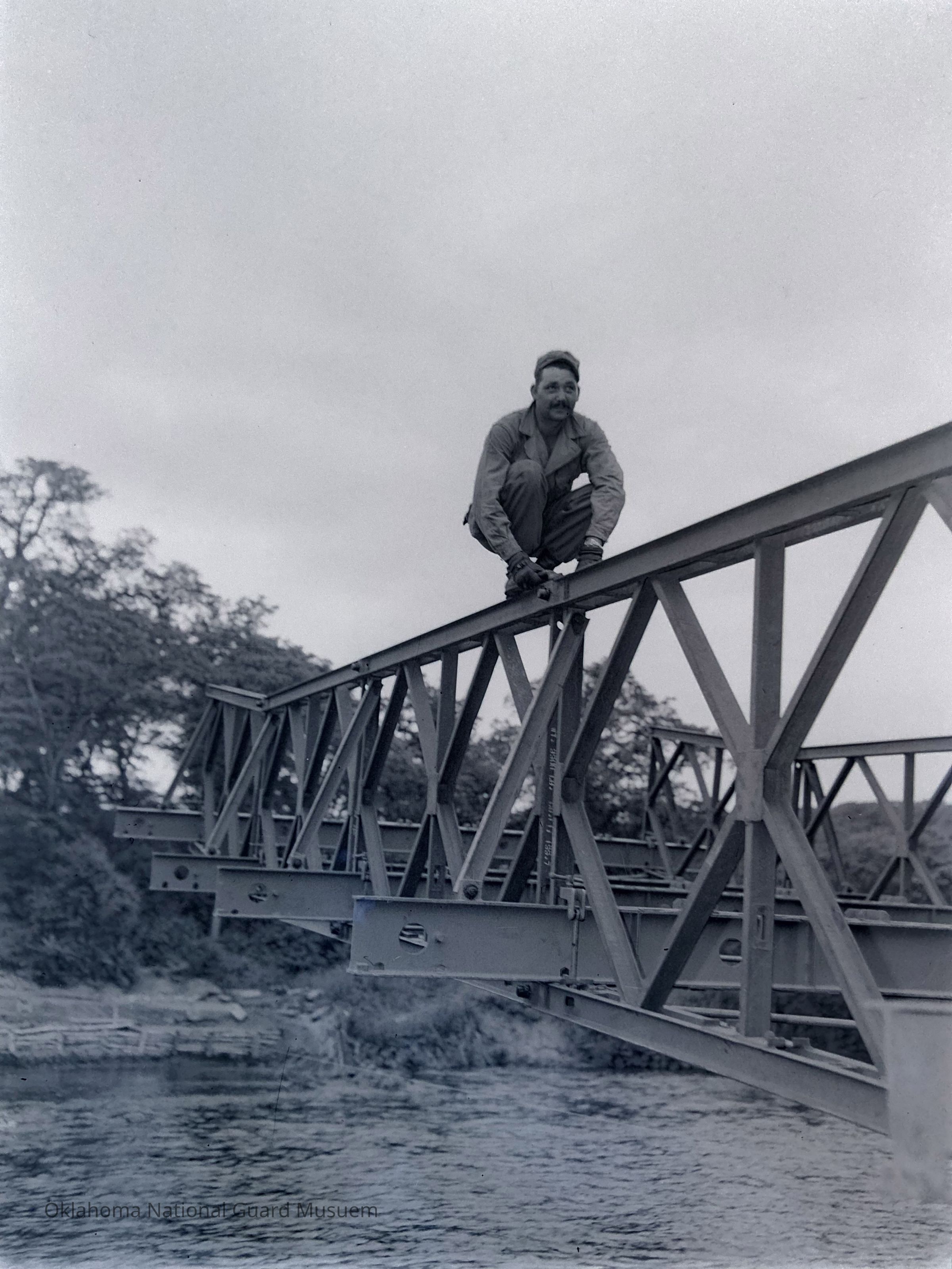 Negative of a soldier constructing a bailey bridge on Hokkaido, Japan. 120th Engineers