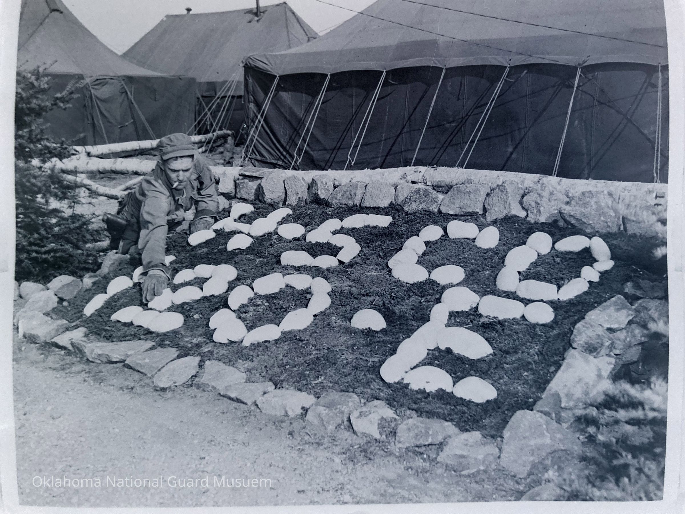 Negative of soldier constructing rock garden sign for 120th Engineer Company in Hokkaido, Japan